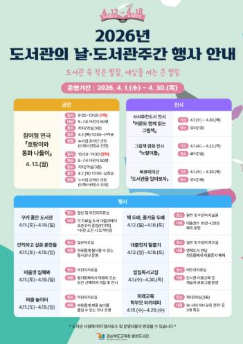 경상북도교육청 봉화도서관은 2026년 도서관의 날·도서관주간을 맞이하여 4월 12일부터 `도서관 속 작은 펼침, 세상을 여는 큰 열림`이라는 주제로 다양한 독서 문화 프로그램을 운영하고 있다. 책 읽기와 연계한 △쿠키 품은 도서관 △간직하고 싶은 문장들 △마음껏 칠해봐 △퍼즐 놀이터 등 다양한 참여형 행사와 △어른도 함께 읽는 그림책 전시 등을 운영 중이다. 특히 지난 13일에는 관내 유치원 및 어린이집을 대상으로 참여형 연극`호랑이와 동화 나들이`를 운영하여, 어린이들이 동화 속 등장인물이 되어 함께 놀이하며 책 속의 지혜도 배울 수 있는 즐거운 시간을 보냈다. 도서관 관계자는“이번 행사를 통해 더 많은 지역 주민들이 도서관에서 책과 친해지고, 함께 읽고 나누는 문화를 일상 속에서 자연스럽게 만들어가는 계기가 되길 바란다.”고 전했다. 자세한 행사 내용은 도서관 누리집 공지사항을 참고하거나 사무실로 문의하면 된다.