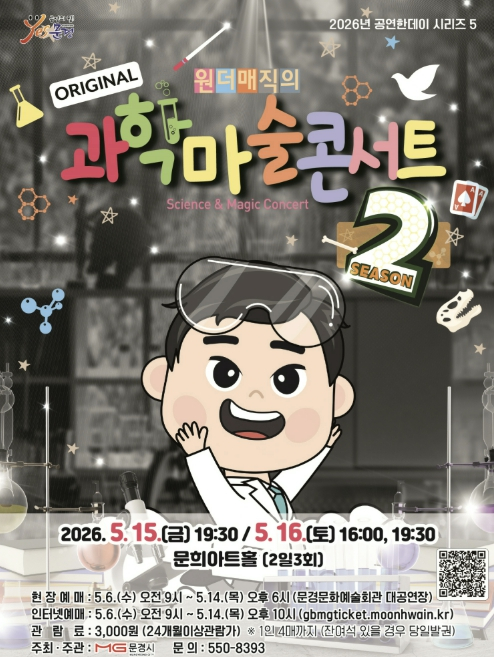 문경문화예술회관에서는 5월 어린이 달을 맞아 마술과 과학의 경계를 넘나들며 온가족 모두가 재미있게 관람할 수 있는 과학마술콘서트 시즌2 공연을 5월 15일 19:30, 16 16:00, 19:30 (2일 3회)에 문희아트홀에서 개최한다.이번 공연은 마술사 최형배가 출연해 마술 속에 숨겨진 과학의 원리에 대해 알아보고 실생활에서도 쉽게 응용할 수 있는 과학의 원리를 배우는 마술공연이다.현재까지도 많은 관객에게 사랑받고 있는 과학마술콘서트 시즌1의 교육적 메시지를 바탕으로 시즌2는 한층 더 확장된 상상력과 창의성 있는 무대를 선보인다.화려한 일루전 마술과 과학적 원리가 결합된 이번 공연은 어린이와 청소년은 물론 가족단위 관객들에게 교육과 재미를 동시에 제공하는 특별한 경험이 될 것이다.국내 3대 일루셔니스트로 손꼽히는 최형배 마술사는 SBS 예능 프로그램 ‘스타킹’의 국내 최초 마술 서바이벌에서 우승하며 대중들에게 얼굴을 알리고 이후 다양한 콘텐츠를 접목한 화려한 무대와 재치 있는 입담으로 아이부터 어른까지 폭넓은 사랑을 받아왔다.대표작으로 기초과학, 미래, 공룡등 다양한 주제를 다룬‘ 오리지널 과학마술콘서트’ 시리즈와 함께 꿈과 희망을 이야기하는 ‘꿈꾸는 매직문’ 압도적 스케일의 ‘울트라매직콘서트’등이 있다.