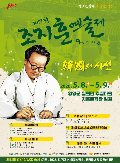 영양군은 우리나라를 대표하는 청록파 시인이자 《지조론》의 저자인 조지훈 선생의 문학정신을 기리고자 오는 5월 8일부터 9일까지 2일간 영양군 일월면 주실마을 일원에서 `제19회 조지훈 예술제`를 개최한다.이번 예술제는 (사)한국문인협회 영양지부가 주최·주관하며 ‘韓國의 시선’을 주제로 문학과 공연, 전시, 체험이 어우러진 종합문화예술 행사로 진행된다.조지훈 예술제는 2007년 첫 회를 시작으로 매년 이어져 온 영양군의 대표 문화행사로, 조지훈 선생의 문학정신을 계승하고 문향 영양의 가치를 널리 알리는 데 기여해 왔다.올해 예술제에서는 전국 규모의 문학 경연과 다양한 문화예술 프로그램이 마련된다. 조지훈 전국백일장 및 사생대회를 비롯해 시 낭송 및 퍼포먼스 전국대회, 문학 강연 등 참여형 문학 프로그램과 함께 초청 공연과 전통 공연이 함께 진행될 예정이다.행사 첫날에는 헌공례와 길놀이를 시작으로 전문 예술단체 공연, 전자바이올린 연주, 전통 민속공연 등이 이어지며 문학과 예술이 어우러진 무대로 펼쳐진다. 전국백일장과 사생대회는 초·중·고 및 일반인을 대상으로 현장에서 진행되며, 유치원생부터 참여할 수 있는 체험형 프로그램을 함께 운영하여 어린이와 청소년이 문학과 예술을 자연스럽게 접할 수 있도록 구성했다.둘째 날에는 조지훈 시를 주제로 한 시 낭송 및 퍼포먼스 전국대회가 열리고, 시상식과 폐막식을 끝으로 이틀간의 일정이 마무리된다.행사 기간 내 지훈문학관과 행사장 일원에서는 다양한 전시와 체험 프로그램도 운영된다. 김난희 여사 작품전과 영양문인협회 시화전, 조지훈 시인 도서 전시를 통해 문학적 깊이를 더하고, 시화 그리기, 전통한지공예, 전통차 체험, 한복 체험, 목공예 체험 등 다양한 프로그램을 마련하여 방문객들이 문학과 예술을 직접 체험할 수 있도록 했다.특히 유치원생과 초·중·고 학생들이 참여할 수 있는 체험형 프로그램을 확대하여 가족 단위 방문객이 함께 즐기고 체험할 수 있는 문화예술 축제로 운영할 계획이다.조지훈 예술제는 매년 전국 문학인과 관광객이 참여하는 문화예술 축제로 자리매김하며, 문학을 매개로 지역과 사람을 잇는 소통의 장으로 발전해 왔다. 영양군은 이번 예술제를 통해 조지훈 선생의 문학정신을 재조명하고, 지역 문화관광 자원의 가치를 널리 알리는 계기가 될 것으로 기대하고 있다.영양군 관계자는 “조지훈 예술제는 문향의 고장 영양을 대표하는 종합문화예술 행사로, 문학과 예술을 통해 군민과 방문객이 함께 공감하고 소통하는 뜻깊은 시간이 될 것”이라며 “가족 단위 방문객들이 함께 참여하고 즐길 수 있는 행사로 준비한 만큼 많은 관심과 참여를 바란다”라고 밝혔다.