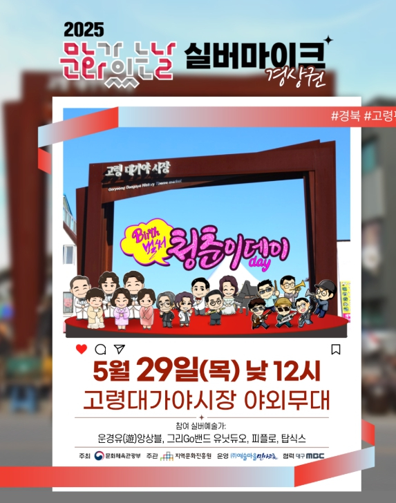 ‘벌써 청춘이데이’ 2025 문화가 있는 날 `실버마이크` 경상권 공연이 가정의 달 5월, 문화가 있는 날과 그 주간에 경북 고령대가야시장 야외무대에서 5월 29일 목요일 12시에 공연이 펼쳐지게 된다. 실버마이크 경상권은 문화체육관광부가 주최하고, 지역문화진흥원이 주관하며 ㈜예술마을민아트홀에서 운영하는 사업으로 문화 기본법 제12조 2항에 근거하여 국민의 문화권을 보장하기 위한 사업이다. 특히 실버마이크 경상권은 대구MBC가 협력으로 참여하여 TV방송과 라디오를 통해 경상권 곳곳의 실버마이크 소식을 국민에게 전달하고 있다. 실버마이크 사업은 실버예술가들의 세대 간 공감·소통이 있는 거리공연으로 국민 문화향유기회 확대에 목적이 있다. 이에 실버예술가들은 사업에 참여함으로 공연 기회 및 홍보 지원을 통해 문화 생산 주체로서 신(新) 노년세대의 문화향유 모델을 제시하고 있다. 실버마이크 경상권 사업은 ‘벌써 청춘이데이’를 주제로 다양한 실버예술가들의 공연을 통해 ‘지금 이 순간, 가장 아름답고 행복한 날’로 고령군민들에게 기쁨과 위로를 전할 예정이다. 5월 29일 목요일 12시 공연에는 양악의 운경유(遊)앙상블, 피플로, 대중음악의 탑식스, 그리Go밴드 유닛듀오 팀이 준비하고 있으며 시민들과 함께 할 수 있는 다채로운 체험프로그램 부스로 ‘청춘타임캡슐 만들기’,‘생일엽서제작’,‘전통놀이체험’,‘소원나무체험’등이 무료로 운영된다. 실버마이크 경상권 실버예술가들은 가정의 달 5월, 경상권 곳곳을 돌아다니며 경상권 도민에게 따뜻한 위로와 감동, 그리고 생일날과 같은 기쁨의 순간을 함께 나눌 예정이다. 사업 전반에 관련한 사항은 ㈜예술마을민아트홀 누리집과 지역문화통합정보시스템을 통해 자세히 안내받을 수 있다.