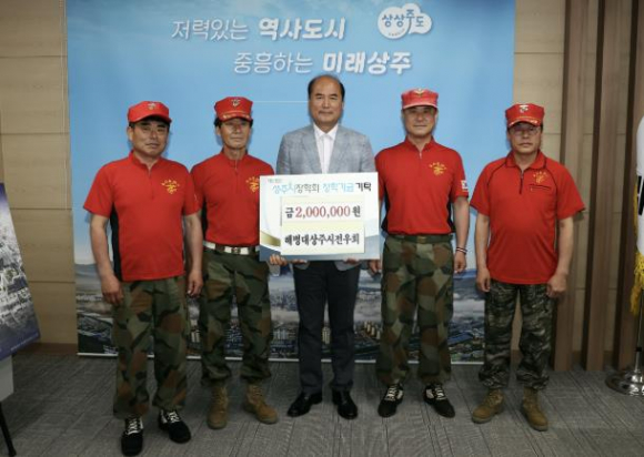 해병대상주시전우회에서는 27일 상주시청을 방문하여 상주시장학회에 장학금 200만 원을 기탁했다.1992년 11월 14일 해병대상주시전우회가 발대하여 17대 최봉호회장을 중심으로 47명의 회원으로 구성되어 있으며 300회가 넘는 크고 작은 축제 및 행사 등에서 봉사활동을 해오고 있다.최봉호 회장은 “상주의 미래인 청소년들이 더 좋은 환경에서 공부할 수 있기를 바라는 마음에서 상주시장학회에 기탁하기로 결심하게 됐다. 이번 장학금은 우리 회원들이 각종 행사 시 주차 및 교통안전요원으로 근무하여 받은 수당 및 식비 등을 적립하여 마련하게 되어 뜻깊은 장학금이다.”라고 말했다.강영석 상주시장은“지역 인재육성을 위해 상주시장학회에 장학금을 기탁 해주셔서 진심으로 감사드리며, 상주의 미래를 이끌어갈 아이들이 잘 성장 할 수 있도록 최선을 다하겠다.”라고 밝혔다.