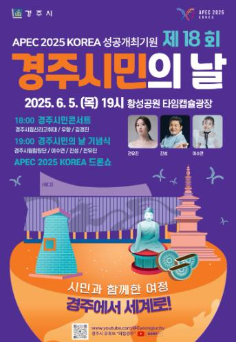 경주시는 다음 달 5일 저녁 황성공원 타임캡슐광장에서 ‘제18회 경주시민의 날 기념행사’를 연다고 28일 밝혔다.경주시민의 날은 신라 건국일(기원전 57년 4월 병진일)을 양력으로 환산한 6월 8일로, 2007년 제정된 관련 조례에 따라 매년 기념행사가 열린다. 올해는 연휴와 시민 참여 여건을 고려해 일정을 앞당겨 진행된다.‘시민과 함께한 여정, 경주에서 세계로!’를 주제로 열리는 이번 행사는 경주의 발전을 이끈 시민의 자긍심을 기리고, 2025 APEC 정상회의의 성공 개최를 기원하는 화합의 장으로 마련된다.행사는 경주시립고취대와 지역 가수 무대가 어우러진 시민 콘서트를 시작으로, 공식 기념식과 축하공연이 이어진다.1부 기념식에서는 ‘기(氣)’ 퍼포먼스와 ‘글로벌 경주’를 주제로 한 개막 영상, 시민헌장 낭독, 경주시 문화상 시상, 자매·우호도시의 영상 축하 메시지 등이 진행된다.2부에서는 ‘신라 건국에서 경주 APEC 개최까지’를 주제로 한 드론 쇼와 초청 가수 진성, 전유진, 이수연의 축하 무대가 펼쳐지며, 불꽃놀이로 대미를 장식할 예정이다.올해 행사는 시민 참여 확대와 관람 편의 향상에 초점을 맞췄다. 내빈 환담 공간과 관람 동선을 분리해 시야 방해를 줄이고, 포토존 설치와 시 상징물 탈인형 이벤트, 시민 콘서트 등 다양한 부대 프로그램도 운영된다.또 행사 전 과정은 경주시 공식 유튜브 채널을 통해 실시간 중계되며, 시는 경찰·소방 등 유관기관과 합동 점검을 실시하고, 관람객 보험 가입과 비상 대응체계 구축 등 안전관리에도 만전을 기하고 있다.주낙영 경주시장은 “이번 행사는 APEC 개최를 계기로 경주의 찬란한 역사와 미래를 시민과 함께 나누는 뜻깊은 자리”라며 “시민이 주인공이 되는 행사인 만큼 많은 참여를 부탁드린다”고 말했다.