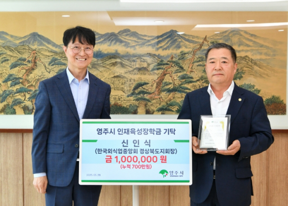 영주시인재육성장학회는 지난 28일, 신인식 한국외식업중앙회 경상북도지회장과 지역 기업 칠공사가 지역 인재 육성을 위한 뜻깊은 마음을 담아 각각 장학금 100만 원을 기탁했다고 밝혔다.축산본점식육식당 대표인 신인식 회장은 영주 한우의 우수성을 널리 알리고 있는 외식업계의 대표 인물로, 2013년부터 꾸준히 장학금을 기탁해 왔으며 현재까지 누적 기탁액은 700만 원에 달한다.신인식 회장은 “이번 기부가 작은 정성이지만 미래를 향해 나아가는 학생들에게 힘이 되길 바란다”며, “앞으로도 외식업계와 지역사회가 함께 성장할 수 있도록 꾸준히 관심을 갖고 응원하겠다”고 말했다.함께 장학금을 기탁한 칠공사는 지역 내 도장 및 창호 전문 업체로, 2012년부터 영주시인재육성장학회와 인연을 맺고 있으며 누적 기탁액은 7400만 원에 이른다.박재훈 대표는 “지역과의 유대 강화를 중요한 가치로 삼고 있다”며 “이번 기부도 지역 인재를 위한 사회적 책임의 일환”이라고 밝혔다.이재훈 영주시장 권한대행은 “각계각층에서 보내주시는 관심과 후원이 지역 청소년들의 꿈과 도전을 이끌어가는 힘이 되고 있다”며 “이런 기부가 지역의 교육 발전과 미래 인재 양성에 소중한 밑거름이 될 것이다”라고 말했다.