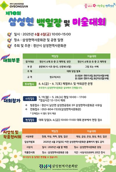 경산시 삼성현역사문화관은 6월 6일 현충일 연휴를 맞아 “제10회 삼성현 백일장 및 미술대회”를 개최한다고 밝혔다.올해로 10회째를 맞는 이번 대회는 삼성현역사문화관 주최로 진행되며 백일장과 미술대회 2개 부문이 실시된다. 또한 6월 6일부터 6월 7일까지 이틀에 걸쳐 삼성현역사문화공원에서 페이스페인팅, 대형 벽화그리기를 비롯한 7가지 다양한 체험 부스와 야외 마술 공연, 빅벌룬쇼 등 방문객들에게 풍성한 즐길거리를 제공한다.백일장은 운문부와 산문부로 나누며, 경산시 소재 초중고 재학생과 성인을 대상으로, 미술대회는 경산시 소재 유초중고 재학생을 대상으로 그림, 서예 부문으로 참가 가능하다. 대회 참가비는 무료이며 대회 당일 현장에서 접수 가능하다. 특히 올해는 백일장 성인부를 신설하여, 방문하는 가족 모두가 참여할 수 있게끔 출전 범위를 넓혔다.대회 후에는 심사를 거쳐 상위 입상자에 대한 시상식을 삼성현역사문화관 강당에서 시행할 예정이며, 입상작은 삼성현역사문화관 내에 전시된다. 이번 대회 개최에 대해 이경식 박물관장은 “삼성현 백일장 및 미술대회는 우리 시의 문학과 예술적 재능을 마음껏 펼쳐보는 기회를 주기 위해 매년 개최 중이며, 올해는 백일장 성인부를 추가하여 참여 대상을 확대했다. 대회 뿐만이 아니라 이틀 동안 다양한 문화 행사가 진행되는 만큼 많은 시민 가족 여러분들께서 참여하시어 삼성현역사문화관과 공원을 즐겨주시길 바란다”고 밝혔다.