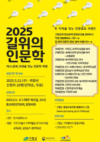 고령군은 문화체육관광부가 주최하고 한국문화예술위원회가 주관하는 ‘2025 길 위의 인문학’공모사업에 선정되어, 고령군과 달성군을 잇는 인문학 프로그램의 참가자를 모집한다. 이번 프로그램은 오는 6월 5일부터 8월 7일까지 매주 목요일 오전 10시부터 12시까지 총 10회에 걸쳐 진행된다. 역사‧문화‧자연을 아우르는 인문로드 여행으로 구성되어 고령과 달성의 문화유산을 함께 공부하고 현장에서 직접 체험할 수 있다. 프로그램은 대가야문화누리에서 강연 6회와 고령군·달성군 탐방 4회로 이루어져 있으며, 참가비는 무료이다. 주요 탐방지는 대가야의 역사와 문화를 품은 가얏고마을, 우륵박물관, 대가야수목원 그리고 달성의 송해공원, 달성습지 생태학습관 등으로 지역의 매력을 깊이 느낄 수 있는 코스로 준비되어 있다. 군 관계자는 “이번 인문학 프로그램은 단순한 강연이 아닌, 지역의 역사와 생태, 문화를 직접 체험하며 배우는 살아있는 인문교육”이라며, “지역민들의 많은 참여를 기대한다”고 전했다. 모집 인원은 20명이며(선착순), 신청방법은 고령군 평생교육포털 홈페이지로 회원가입 후 신청할 수 있으며, 문의는 고령군 가족행복과 평생교육팀로 하면 된다.