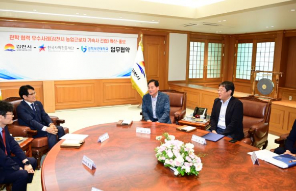김천시는 지난 28일 한국사학진흥재단, 경북보건대학교와 관학 협력 우수사례 확산 및 홍보를 위한 업무협약을 체결했다. 이번 협약은 김천시가 농업 근로자 기숙사 건립 공사 추진 과정에서 교육부 산하 한국사학진흥재단의 우수한 관학 협력 사례로 선정됨에 따라, 타 지자체 확산모델로 홍보하기 위해 각 기관 협의를 거쳐 추진됐다. 특히, 올해 개정된 학교복합시설 설치 및 운영·관리에 관한 법률에 따라 교육부가 추진 중인 학교복합시설 활성화 정책의 추진 사례로 김천시 농업 근로자 기숙사 건립 사업을 선정했다는데 큰 의미가 있다고 전했다. 이날 협약식에서 배낙호 시장은 “이번 협약은 경북보건대 제공부지에 김천시가 건립하는 농업 근로자 기숙사 건립 사업의 성공적인 추진과 협업 사례 확산을 위한 것이다.”라며, “농촌 인력난 해소 및 인건비 안정화 등 지방 소멸 위기 상황에 대응하기 위해 지자체, 학교가 협력하여 상생하는 선도모델로 최선을 다하겠다.”라고 전했다.