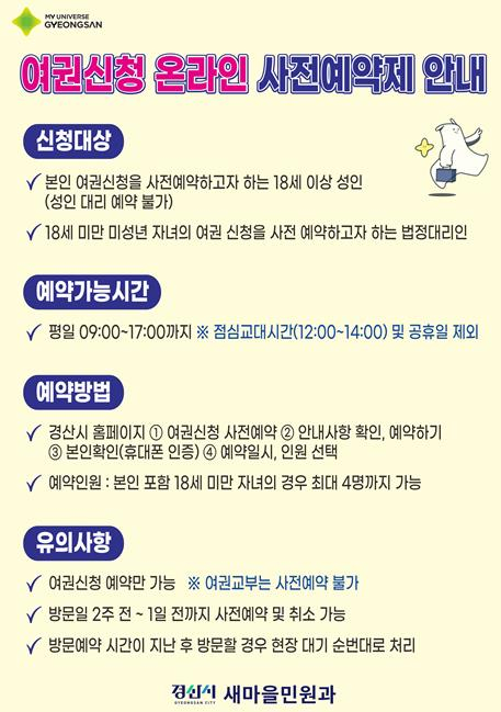 경산시는 민원인의 편의 증진과 현장 대기시간 단축을 위해 오는 6월 2일부터 ‘여권신청 온라인 사전예약제’를 시행한다.이번 제도 도입으로 여권 신청자는 사전에 방문 일정을 예약함으로써 긴 대기 없이 신속하게 여권 업무를 처리할 수 있게 됐다. 사전예약은 여권신청 업무에 한해 가능하며, 경산시청 홈페이지 메인화면의 ‘여권신청 사전예약’ 메뉴를 통해 본인 인증 후 예약할 수 있다.예약은 방문일 기준 2주 전부터 전날까지 가능하며, 운영시간은 평일 오전 9시부터 오후 5시까지로, 공휴일 및 점심 교대 시간인 오전 12시부터 오후 2시까지는 예약이 제한된다. 또한 예약 가능 인원은 본인 포함 18세 미만 자녀의 경우 최대 4명까지 예약할 수 있다. 시는 6월 한 달간 시범 운영을 거쳐 7월부터 정식 운영에 들어갈 예정이다.한편 경산시는 2025년부터 여권민원 서비스 개선 대책의 일환으로 임산부 및 영유아 동반 민원인을 위한 우선 처리 창구를 운영하고 있으며, 민원실 내에는 유아휴게실도 설치해 가족단위 민원인의 편의를 높이고 있다.조현일 경산시장은 “이번 온라인 사전예약제 도입으로 시민들의 대기시간을 줄이고 더 편리한 민원 환경을 제공할 수 있을 것”이라며 “앞으로도 시민 중심의 민원 서비스를 지속 확대해 나가겠다”고 말했다.