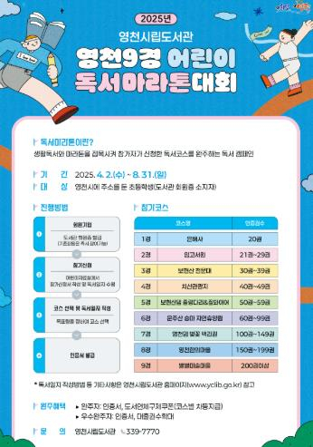 영천시 평생학습관은 4월부터 초등학생들의 독서 활성화를 위한 ‘영천9경 어린이 독서 마라톤대회’를 성황리에 운영 중이다. 이번 행사는 영천시에 주소를 둔 초등학생을 대상으로, 도서관에서 대출한 책을 스스로 읽고 감상평을 독서일지에 작성해 독서 인증을 받는 방식으로 진행된다.참가자는 9개의 코스인 △1경 은해사(20권) △2경 임고서원(21권~29권) △3경 보현산 천문대(30권~39권) △4경 치산광광지(40권~49권) △5경 보현산댐 출렁다리&짚와이어(50권~59권) △6경 운주산 승마 자연휴양림(60권~99권) △7경 영천댐 벚꽃 백리길(100권~149권) △8경 영천한의마을(150권~199권) △9경 별별미술마을(200권 이상) 중 하나의 코스를 선택하면 된다.현재 초등학생 60여 명이 영천9경 어린이 독서 마라톤대회에 참여 중이며, 완주자에게는 완주인증서, 도서연체 구제쿠폰 및 2026년 도서 대출권수 확대 등의 혜택이 제공된다.이번 대회를 통해 어린이들이 규칙적인 독서 습관을 형성하고 책 읽는 문화를 정착시키는 데 기여할 것으로 기대되며, 자세한 내용은 시립도서관 홈페이지 또는 전화 문의를 통해 확인할 수 있다.