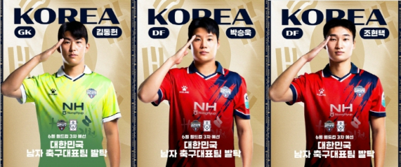 김천상무의 ‘국대 3인방’이 대표팀 발탁에 대한 각오를 전했다.김천상무프로축구단(대표이사 이재하, 국군체육부대장 진규상)의 김동헌, 박승욱, 조현택이 ‘2026 FIFA 북중미 월드컵’ 아시아 3차 예선을 치르는 A대표팀 발탁 각오를 전했다. 이들은 6월 6일과 10일 각각 이라크와 쿠웨이트를 상대로 출전을 기다리고 있다.◇ 김동헌, “영광스러운 자리, 모든 분께 감사 ▶ 더 많은 것 배우고파”김동헌은 이번 대표팀 발탁에 대해 “대표팀이라는 영광스러운 자리에 뽑히게 되어 정말 기쁘다.”라고 소감을 밝혔다. 이어 “최초 발탁 이후 계속 대표팀을 바라보며 준비하고 경기에 임했다. 다시 발탁되어 감사하고 응원해 주시는 모든 팬 여러분께도 감사하다.”라고 인사를 전했다.두 번째 발탁인 만큼 그는 남다른 각오도 드러냈다. “첫 발탁 때는 긴장도 많이 되고 어색하기도 했다. 시간이 너무 금방 흘러간 것 같다. 결과도 아쉬웠는데, 이번 소집에서는 다시 한번 (조)현우형과 (이)창근이형께 많이 배우고 싶다. 결과도 우리 대표팀이 월드컵 본선에 진출할 수 있도록 보탬이 되겠다.”라고 말했다.◇ 박승욱 “전역 선물을 받은 것 같아, 경쟁력 입증하고 싶다”박승욱은 이번 대표팀 발탁을 ‘전역 선물’과 같다고 표현했다. 그는 “이번 달 전역을 앞두고 있는데, 전역 선물을 받은 것 같다. 김천상무 동료들 덕분에 이루어 낸 것 같아 고마움을 전하고 싶다.”라고 소감을 말했다.지난 대표팀 소집에서는 아쉽게 출전하지 못한 만큼 이번에는 각오도 남다르다. “지난 3월에 이어 다시 발탁되어서 기분이 좋지만, 경기를 뛰지는 못했다. 이번에는 출전하게 된다면 더 성장한 나를 보여주고 경쟁력을 입증하고 싶다.”라고 굳게 다짐했다.◇ 조현택 “매 순간 간절하게, 더 성장하는 계기되도록”조현택도 김동헌과 마찬가지로 두 번째로 대표팀에 발탁됐다. 그는 “운이 좋게도 또 뽑히게 됐다. 실감이 나지 않지만, 영광스럽게 생각한다.”라고 겸손하게 말했다. 이어 “출전 기회가 당연하다고 생각하지는 않는다. 그래도 적은 시간이라도 출전하게 된다면 국가대표 선수라는 이름에 누가 되지 않도록 매 순간 최선을 다하겠다.”라고 각오했다.두 번째 발탁에 관한 생각도 나타냈다. “두 번째 발탁이라고 해서 다른 느낌은 딱히 없다. 첫 소집과 마찬가지로 다시 오지 않을 소중한 기회라고 생각한다. 최선을 다하고 간절하게 임하겠다. 대한민국 최고의 선수들과 호흡을 맞추는 만큼 좋은 영향력을 받고, 많이 배우며 더 성장할 수 있는 계기로 삼겠다.”라고 힘주어 말했다.한편, 김천상무는 A매치 휴식기 이후 6월 14일 포항스틸러스와 ‘하나은행 K리그1 2025’ 18R 홈경기를 치른다.