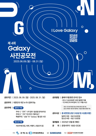 구미시와 구미상공회의소는 삼성전자, LG경북협의회와 함께 6월 9일부터 8월 31일까지 전국민을 대상으로 사진·영상 공모전을 개최한다. 총상금 및 상품 규모는 `제4회 Galaxy 사진공모전` 6천만원, `제3회 LG 영상공모전` 2천5백만원 상당이다.이번 공모전은 구미시가 기업사랑 사업의 일환으로 추진하는 것으로, 시민이 지역 대기업에 대한 관심을 갖고 기업과 도시가 함께 성장하는 상생의 이미지를 형성하기 위해 마련됐다.○ Galaxy 사진공모전… 올해 청소년 부문 신설올해로 4회째를 맞는 Galaxy 사진공모전은 삼성 갤럭시 휴대폰으로 촬영한 사진을 출품 대상으로 한다. 기존의 일반 부문에 더해 올해부터는 청소년 부문이 새롭게 추가되어 참여의 폭이 더욱 넓어졌다.일반 부문은 △나의 일터·일상, △구미, △삼성을 주제로 하며 청소년 부문은 맛집, 축제, 여행지, 산업단지 등 △자유 주제로 진행된다. ○ LG 영상공모전… 창의적인 1분 30초 영상 경쟁제3회를 맞는 LG 영상공모전은 참가자가 직접 기획하고 제작한 1분 30초 이내의 영상 작품을 대상으로 한다. 개인 또는 팀 단위로 응모할 수 있으며, 주제는 △LG와 관련된 모든 주제 또는 △구미시와 관련된 모든 주제 가운데 자유롭게 선택할 수 있다.○ 전문가 심사와 인기 투표 병행… 수상작은 전시·홍보에 활용접수된 작품은 활용성, 창의성, 완성도, 주제 적합성을 기준으로 전문가 심사(70%)와 일반인 인기 투표(30%)를 병행해 평가한다. 올해 처음 도입된 인기 투표는 공모전의 대중성과 참여도를 높이는 데 기여할 것으로 기대된다.각 부문 수상자에게는 대상 500만원, 금상 250만원 등의 상금이 수여되고 사진공모전에는 삼성 갤럭시 제품이, 영상공모전에는 LG의 제품이 제공된다.최종 수상작은 10월 중 시상식과 함께 전시회에서 공개되며, 홈페이지를 통한 온라인 갤러리에도 전시될 예정이다. 더불어 수상작은 각종 홍보영상 및 홍보물로 제작되어 축제나 행사 등 다양한 현장에서 구미시와 지역기업을 널리 알리는 데 활용된다.공모전 접수는 PC와 모바일로 공식 홈페이지를 통해 온라인 접수 가능하며 기타 궁금한 사항은 운영 사무국에 문의하면 된다.○ 기업과 도시가 함께 성장하는 구미윤재호 구미상공회의소 회장은 “사진·영상 공모전을 통해 구미 앵커기업의 기(氣)를 살리고, 문화와 산업이 공존하는 산업단지로 나아가는 데 일조할 수 있기를 기대한다”고 밝혔다.김장호 구미시장은 “청소년 부문을 신설한 만큼 청소년들의 참신하고 창의적인 시선이 담긴 작품들을 기대하고 있다”며 “자연과 문화, 산업이 조화를 이루는 도시 구미와 함께 성장하는 기업에 많은 관심과 참여를 바란다”고 밝혔다.