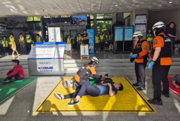 경산소방서는 6월 4일 경산시 백천동에 위치한 ‘중소벤처기업진흥공단 대구경북연수원’에서 다수사상자 발생 대비`119구급대 임시의료소 운용훈련` 실시했다고 밝혔다.이날 훈련에는 경산소방서 소속 119구급대원 및 연수생, 연수원 직원 등 120여 명이 참여했다. 특히 국토순례를 위해 연수 중인 한국백혈병소아암협회 환우와 가족 100여 명이 함께해 소방안전강사로부터 심폐소생술 · 재난대피요령에 대해 교육받고, 실제로 ‘임시의료소 운용훈련’에 참가해 재난상황 대처법을 경험으로 터득했다.한편, 소방 매뉴얼에 의하면 현장지휘관은 재난 현장이 다수사상자 발생 우려가 현저하거나 발생했다고 판단되는 경우, 지휘통제절차에 따라 재난 초기부터 임시의료소를 설치·운용해야 하며, 이에 따라 경산소방서는 현장지휘단장의 주도하에 올해 2분기 부터 고층건물, 불특정 다수 이용시설 그리고 대형공장 위주로 월(月) 단위로 자체적으로 임시의료소 운용 훈련을 실시하고 있다.한창완 서장은“소방훈련에 적극 참여한 소속 직원들과 특히 중소벤처기업진흥공단 연수원 관계자와 연수생들에게 깊이 감사드린다”면서 “경산소방서는 현장지휘체계 강화를 위한 훈련을 계속해 나갈 것이며, 발견된 문제점은 반드시 개선하여 재난으로부터 시민들의 안전을 지켜 나가도록 최선을 다하겠다”고 말했다.