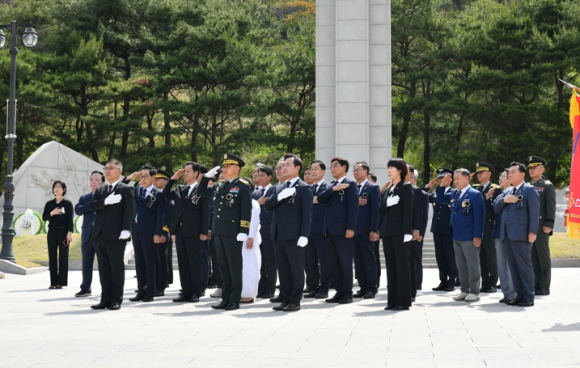 경상북도는 6일 국립영천호국원에서 순국선열과 호국영령의 고귀한 희생과 헌신을 기리기 위해 ‘제70회 현충일 추념식’을 엄숙히 거행했다.이번 추념식은 김학홍 부지사를 비롯한 최병준 경상북도의회 부의장, 임종식 경상북도교육감, 박성훈 육군3사관학교장 등 기관단체장과 국가유공자 유가족, 참전유공자, 군인 등 1,000여 명이 참석해, 조국을 위해 헌신한 순국선열과 호국영령의 숭고한 희생정신을 추모했다.추념식은 오전 10시 정각, 전국적으로 울린 사이렌에 맞춰 1분간 묵념을 올린 것을 시작으로, 국민의례, 헌화 및 분향, 추념사, 유족편지낭독, 추모공연 등의 순으로 진행됐다.유족 편지 낭독 시간에는 6·25전쟁 참전유공자로 2022년 영천호국원에 안장된 故 육군중사 이성춘님의 자녀인 이경순 씨가 아버지에 대한 그리움을 담아 ‘현충일에 드리는 편지’를 낭독해, 참석자들에게 깊은 울림과 감동을 전했다.이어진 추모공연에서는 성악가 8명으로 구성된 혼성중창단의 성악 앙상블이 펼쳐져, 순국선열과 호국영령을 향한 추모의 정서를 더욱 고조시켰다.공식 행사가 끝난 후, 부지사와 군 관계자들이 무연고 묘소를 참배하고 나라를 위해 희생한 호국영령은 우리가 끝까지 책임진다는 의지를 표명했다.김학홍 경북도 행정부지사는 추념사를 통해 “순국선열의 우국충정을 되새기고, 국가유공자와 유가족의 명예가 존중받을 수 있도록 정성껏 예우해 나가겠다”며 “아울러 절체절명의 위기에 굴하지 않은 경북과 경북인의 정신으로 초대형 산불을 극복하고 경주 APEC 행사를 성공적으로 개최하겠다”고 밝혔다.