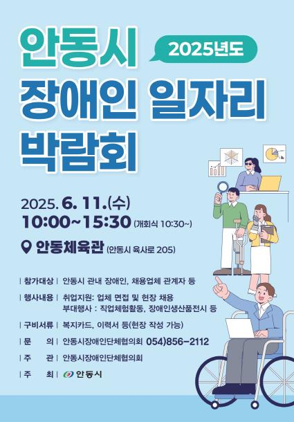 안동시는 오는 6월 11일 오전 10시, 안동체육관에서 ‘장애인일자리 박람회’를 개최한다고 밝혔다. 이번 박람회는 안동시가 주최하고 안동시장애인단체협의회가 주관하며, 경북 도내 지자체 중 최초로 열리는 장애인 대상 일자리 박람회로 주목을 받고 있다.애초 올해 3월 26일 개최 예정이었으나, 대형 산불 재난 여파로 일정이 연기돼 이날 드디어 문을 열게 된다. 특히 이번 박람회는 기술, 생산, 서비스 등 다양한 분야에서 활동 중인 기업체 40여 곳이 참여, 실질적인 구직 연결의 장이 될 전망이다.참여기업으로는 △나눔공동체 △명인 안동소주 △안동 제비원 △청해식품 △탁촌장 △396커피컴퍼니 등 지역 식품 제조업체를 비롯해, △청옥보호작업장 △참사랑보호작업장 △인교보호작업장 △영가재활원과 같은 중증장애인 직업재활시설, 그리고 자동차 부품 제조업체인 △자원산업사 △경상북도 안동의료원 등 다양한 분야의 기관이 포함됐다.이번 행사는 단순 채용 부스를 넘어 장애인 구직자들이 기업과 직접 상담을 통해 자신의 적성과 능력을 발휘할 수 있는 일자리를 찾는 데 실질적인 도움을 주는 데 목적이 있다. 박람회장에서는 현장 면접, 직무 상담뿐 아니라 취업 관련 정보 제공과 연계 지원 서비스도 함께 제공된다.또한 이번 박람회를 축하하기 위해 지역 특수학교 학생 20여 명이 풍물놀이와 무대 댄스를 선보이며 축제 분위기를 더한다.시는 이번 박람회 종료 후 ‘성과 공유회’를 열어 구인․직자 간 연결 성과를 분석하고, 향후 지원 방안을 체계적으로 마련할 계획이다.권기창 안동시장은 “이번 박람회는 장애인과 기업이 직접 만나 고용 가능성을 확인하고 일자리 연결을 실현하는 뜻깊은 자리”라며, “장애인이 안정적으로 사회에 진입하고 지역 경제에 기여할 수 있도록 지속적인 일자리 창출과 사후 지원을 강화하겠다”고 밝혔다.안동시는 현재 일반형, 복지형, 특화형 등 장애인 일자리 유형별 사업을 통해 총 184명에게 일자리를 제공하고 있으며, 5월 말 기준 장애인 인구는 13,200명, 장애인 의무고용 사업체는 138곳에 이른다.