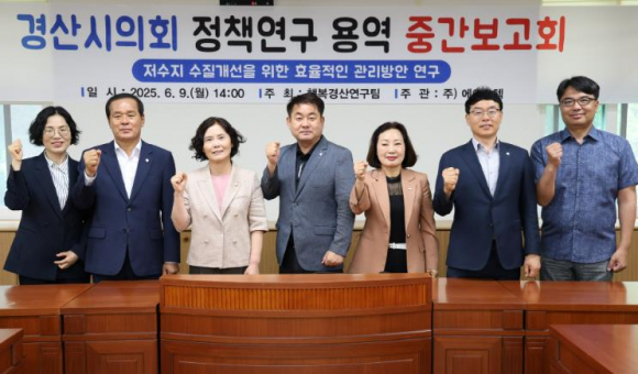 경산시의회 의원연구단체 `행복경산연구팀`은 6월 9일 의회 운영위원회 회의실에서 `저수지 수질개선을 위한 효율적인 관리방안 연구` 중간보고회를 가졌다.행복경산연구팀은 윤기현, 김인수, 김정숙, 박순득, 손말남 의원으로 구성되어 있으며, 도시화와 농업환경 변화로 기능을 상실하거나 방치된 경산 관내 저수지의 실태를 조사하고, 이에 따른 수질 오염 문제를 해결하기 위해 지난 3월 연구용역에 착수했다.이날 중간보고회는 ▲ 경산시 저수지의 현황과 수질 오염 실태 분석 ▲ 대표 저수지(문천지, 남매지, 소월지 등)별 오염원인과 개선현황 발표 ▲ 국내·외 우수사례 분석 ▲ 저영향개발(LLD)기법과 수질정화기술 적용 방안 등 구체적인 연구성과가 공유됐다.행복경산연구팀 의원들은 ˝이번 중간보고회를 통해 지역 저수지의 수질 문제에 대한 객관적인 진단과 함께 실질적인 개선 방안을 모색할 수 있었으며, 지속가능한 수자원 환경을 조성하는데 최선을 다하겠다.˝고 밝혔다.