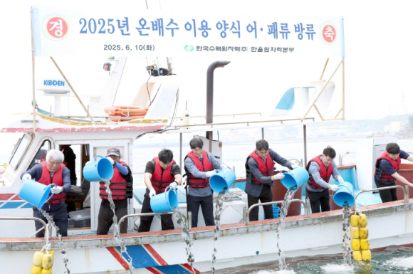 한국수력원자력(주) 한울원자력본부는 6월 10일 한울본부장, 어촌계장협의회장 및 어민대표들과 함께 울진군 석호항에서 원전 온배수로 키운 어패류 방류행사를 시행했다.석호․나곡 앞바다에 강도다리 치어 3만미를 방류했고, 어촌계 주변 암반에 전복치패 2만미를 부착했다.한울본부는‘바다의날’을 기념하여 1999년부터 매년 온배수 이용 양식 어․패류 방류사업을 이어왔으며, 올해까지 총 270만미의 치어와 치패를 원전 인근 해역에 방류했다.어촌계협의회장은 “어족자원과 어민들의 생계에 대한 지속적인 고민과 도움을 주는 한울본부에 진심으로 감사하고, 치어와 치패가 잘 자라 만선할 수 있기를 바란다”라고 말했다.이세용 본부장은 “한울본부가 지속적으로 시행해 온 어패류 방류가 어민 소득 증대와 어족자원 형성에 기여해서 기쁘고, 앞으로도 지역사회와 발맞추어 함께 가기 위해 노력하겠다”라고 말했다.