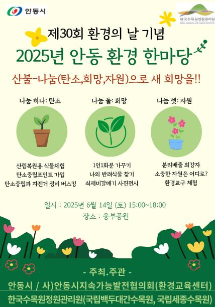 안동시는 제30회 환경의 날을 기념하여 오는 6월 14일 오후 3시부터 웅부공원 일원에서 ‘2025 안동 환경 한마당’ 행사를 개최한다.이번 행사는 ‘산불 나눔을 통한 새 희망’이라는 주제로 열리며, 지난 대형산불로 인한 피해를 시민과 함께 극복하고 지속 가능한 환경보전의 중요성을 알리기 위해 마련됐다.이날 행사는 안동시와 한국수목원정원관리원, (사)안동시지속가능발전협의회, 안동시환경교육센터가 공동으로 주최하며, 플라스틱 오염 종식과 탄소중립 사회 실현을 위해 다양한 체험 프로그램을 운영한다.전체 프로그램은 △탄소 나눔 △희망 나눔 △자원 나눔의 세 가지 테마로 구성된다.국립백두대간수목원이 주관하는 ‘탄소 나눔’ 부스에서는, 산불피해 지역에 식재 가능한 산림생태 복원용 자생식물(94종)과 생태복원 우수사례를 소개한다. 또한 탄소중립포인트제에 대한 안내와, 자전거 정비 버스킹 프로그램도 함께 운영돼 시민이 생활 속 에너지 절약을 실천할 수 있도록 돕는다.‘희망 나눔’ 부스는 산불 피해로 심리적 어려움을 겪은 시민을 위해 마련된 힐링 체험 공간이다. 국립세종수목원에서 파견된 나무의사(수목 진료 전문가)가 직접 참여하는 이동식 반려식물 클리닉이 운영되며, 1인 1화분 가꾸기로 가정에서부터 녹색생활을 실천할 수 있도록 국립백두대간수목원에서 준비한 한국특산식물(섬기린초 등 5종) 2,000본을 나눠 줄 예정이다. ‘자원 나눔’ 부스에서는 분리배출 OX 퀴즈, 나무 목걸이 만들기 체험 등을 통해 자원순환의 중요성을 쉽고 즐겁게 배우게 된다. 또한 한국수목원정원관리원은 직접 제작한 자생식물 씨앗 카드 5,000개를 시민에게 배포하고, 안동시환경교육센터는 환경교육용 교구 및 학습 자료를 활용한 체험 부스를 운영한다.안동시 관계자는 “이번 ‘2025 안동 환경 한마당’은 직접 환경보호를 체험하고 실천하는 소중한 기회가 될 것”이라며, “환경의 날 행사에 시민 여러분의 많은 관심과 적극적인 참여를 바란다”고 전했다.