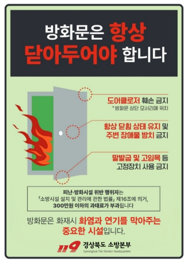 경산소방서는 공동주택 화재 발생 시 인명 피해를 최소화하고 시민들의 안전 의식을 높이기 위해 ‘방화문 닫기’ 안전문화운동을 연중 추진한다고 밝혔다.최근 공동주택 화재로 인한 대형 사고가 잇따라 발생하면서 방화문 닫기 안전문화의 중요성이 더욱 강조되고 있다. 특히, 방화문이 열려 있을 경우 화재가 더욱 확산되고, 인명 피해가 더 커지는 위험 상황이 발생할 수 있기 때문에 방화문 닫기의 중요성은 더욱 크다고 할 수 있다.경산소방서는 공동주택, 아파트, 상가 등 다양한 시설에서 방화문닫기 캠페인을 실시하여 방화문 상태를 점검하고 방화문 픽토그램, 안내 유의사항을 담은 포스터를 제작하여 시민들에게 널리 알리고 방화문 닫기 안전교육을 제공하고 있다.한창완 소방서장은 “방화문은 화재 발생 시 인명 피해를 막는 중요한 안전장치이고 시민들의 안전을 위해 방화문 닫기 안전문화를 확산시키는 것은 소방서의 중요한 책임”이라며, “이번 안전문화운동을 통해 방화문 닫기 안전 의식을 높이고, 공동주택 화재로 인한 인명 피해를 최소화하는 데 최선을 다하겠다”고 강조했다.