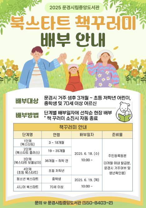 문경시립중앙도서관은 오는 6월 18일부터 문경시민을 대상으로 북스타트 책꾸러미를 배부하는 행사를 진행한다. ‘책과 함께 인생을 시작하자’는 취지로 시작된`북스타트(Book Start)`는 북스타트코리아와 지방자치단체가 협력해 연령별 책꾸러미를 무료로 배부하는 독서문화 운동이다. 이번 행사는 책과 함께하는 생활 속 독서문화 정착을 위해 마련됐으며, 총 420개의 책꾸러미가 배부될 예정이다.6월 18일 오전 10시부터는 북스타트 1~4단계 대상자인 생후 3개월 ~ 초등 저학년을 대상으로 한 책꾸러미가 배부되며, 6월 19일 오전 10시부터는 중학생 및 70세 이상 어르신을 위한 책꾸러미가 각각 배부된다. 각 단계별 책꾸러미에는 연령에 적합한 도서와 독서 가이드, 책가방, 기념선물 등이 포함되어 있다.배부는 선착순으로 소진시까지 진행되며, 수령 시 3개월 이내 발급된 주민등록등본을 지참하여야 한다.엄원식 문화예술회관장은 “책꾸러미를 통해 모든 세대가 책을 더욱 가까이하고, 세대 간 소통의 기회도 넓어지길 바란다”고 전했다.