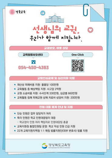 경북교육청은 도내 모든 교원을 대상으로 ‘교권보호 바로상담’ 안내장과 안내 카드를 제작․배부하여 교권 보호 지원을 강화한다고 16일 밝혔다. 이번 조치는 교육활동 침해 상황에서 교원들이 교육청의 체계적인 지원을 직접 체감할 수 있도록 돕기 위해 마련됐다.교권 보호 안내자료에는 △교권 담당 장학사 연락처 △교육활동보호센터 누리집 QR 코드 △교원안심공제와 교원 심리 치유 지원 안내 △민원 대응 체계와 지원 등 실질적인 지원 정보가 담겨있다.교원은 교육활동 침해 상황이 발생했을 경우 언제든지 교육활동보호센터 장학사와 직접 상담이 가능하며, QR 코드로 접속 시 게시판을 통해서 심리 및 법률상담을 쉽게 신청할 수 있다. 이외에도 △교육활동 중 배상책임 지원 △소송비용 지원 △재산상 피해 비용 지원 등 다양한 교원안심공제 내용을 담고 있으며, 특이 민원은 민원대응팀이 공동 대응하고, 학교장은 민원 처리의 최종 책임자임을 명시해 교원의 부담을 최소화하고, 아동학대 피신고 등에 대해서 변호사의 도움을 받을 수 있는 법률지원단의 내용도 포함하고 있다. 경북교육청은 이번 안내자료를 모든 학교 교무실에 게시하고, 안내 카드는 교사 개인 책상에 부착하도록 안내해 교원이 필요시 즉시 도움을 받을 수 있도록 원스톱 서비스를 제공할 계획이다.임종식 교육감은 “교권보호는 교원을 보호하는 것을 넘어, 교육의 질을 높이고 학생들에게 건강한 학습 환경을 제공하는 아주 중요한 일”이라며, “이번 안내자료 배부를 통해 교권보호에 대한 인식을 높이고, 교원들이 실질적인 지원을 신속하게 받을 수 있도록 지원을 아끼지 않겠다”라고 말했다.