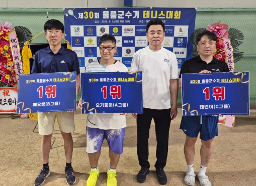 울릉군은 지난 14일 제4회 울릉군수기 테니스 대회가 울릉군 서면에 위치한 남양테니스장에서 개최 됐다고 전했다.울릉군 체육회(회장 공호식)가 주최하고 울릉군 테니스협회(회장 이진표)가 주관하는 이번 대회는 관내 36명의 선수가 참여했다.특히 이번 대회는 2019년 제3회 대회 이후 6년 만에 재개되는 대회로 이를축하하기 위해 김인술 경북테니스협회 회장과 배상호 전무가 개회식에 직접 참여하여 선수들을 격려하는 등 뜻깊은 대회가 됐다경기는 매 게임 파트너를 바꾸면서 경기하는 한울방식(동호인 게임방식)을 적용하여 오기둥이, 해호랑이, 테린이 세 그룹으로 구성되어 진행됐으며 결과는 김현광, 정기영, 김준혁 선수가 그룹별 우승을 차지했다.남한권 울릉군수는 “여러 사정으로 인해 명맥이 끊겼던 테니스대회를 다시 개최 할 수 있게 되어 기쁘게 생각한다.”라며“ 이번 대회를 기회로 동호인들간의 친목을 다지고 지역사회가 화합하는 분위기를 조성하는 계기가 계기가 되기 바라며, 앞으로도 다양한 체육활동을 지원해서 주민 화합의 장을마련할 수 있도록 노력하겠다”고 전했다.