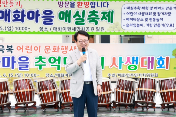 울진군 매화면은 지난 6월15일 매화 이현세만화공원 일원에서 600여명 참가한 가운데‘제2회 매화마을 매실축제’를 성황리에 개최했다. 이번 축제는 지난해‘매화나무 주인찾기’행사에 이어‘매화마을 추억만들기’라는 주제로 열렸으며, 특히 어린이와 함께하는 가족단위 체험행사 위주로 프로그램 운영을 통해 저출산위기에 처한 매화면에 모처럼 활기와 웃음을 불어넣는 계기가 됐다. 이날, 농악대와 난타, 버스킹 공연으로 시작된 행사는 전문MC의 진행으로 끼 많은 부모님과 어린이들이 각종 장기자랑을 선보이며 많은 이들에게 웃음을 선사했고 각종 게임에 남녀노소가 함께 참가해 즐거운 시간을 가졌다. 올해 축제에서는‘매화마을 추억만들기 사생대회’가 함께 개최되어 사전접수부터 130여 명의 어린이들이 지원하며 이번 행사에 많은 관심과 열기를 느끼게 했다. 매실수확체험 또한 많은 이들이 참여하여 싱그럽게 익은 매실을 가족단위로 삼삼오오 모여 즐겁게 수확했고, 지난해 매화나무 찾기 행사에 참여했던 매화나무주인들은 올해도 각자의 나무를 정성껏 관리하며 뜻깊은 시간을 보냈다. 이밖에도 매화키링 만들기, 스마트폰 사진인화, 슬라임 놀이 등을 비롯하여 에어바운스와 블록 놀이 존도 운영되어 어린이 방문객들에게 큰 호응을 얻었다. 특히, 매화면발전협의회에서는 축제 방문객들을 위해 젤라또, 크로플, 바비큐를 무료로 제공하며 인심 넘치는 매화면의 정을 느끼게 해주었다. 이만호 매화면장은“이번 행사는 지역사회단체가 함께 만들어간 주민중심 축제로서 매화면의 저력과 공동체 정체성을 확인할 수 있는 뜻깊은 자리였다”며“축제를 빛내주신 모든 분들께 진심으로 감사드린다”고 밝혔다.