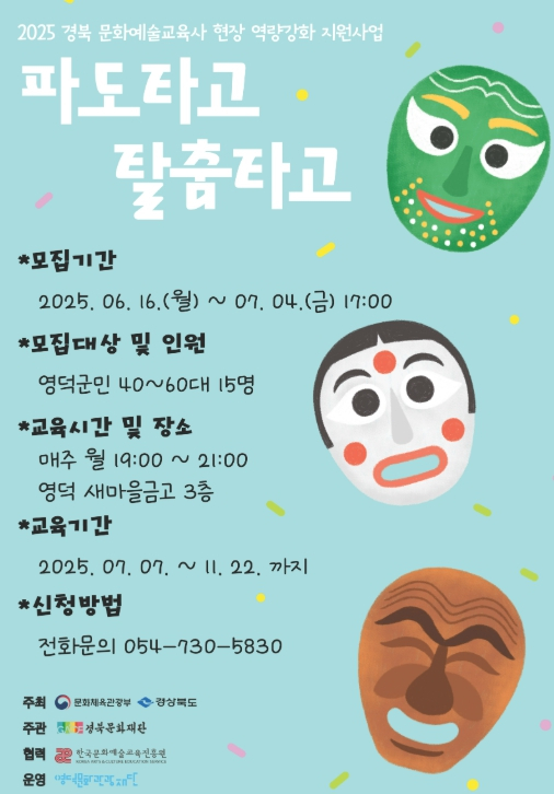 (재)영덕문화관광재단은 문화체육관광부와 경상북도가 주최하고 경북문화재단이 주관하는 ‘2025 경북 문화예술교육사 현장역량강화사업’의 일환으로 전통 탈춤을 활용한 문화예술교육 프로그램 `파도 타고 탈춤 타고`를 시작한다고 밝혔다. ‘2025 경북 문화예술교육사 현장역량강화사업’은 만 39세 이하의 신규 문화예술교육사를 지역 문화시설에 배치해 실무 중심의 직무 역량을 기를 수 있도록 돕고, 문화예술교육사가 지역의 자원을 활용하여 특화 프로그램을 개발, 주민들의 문화예술 참여를 확대하는 것에 목표를 두고 있다. 본 사업에서 올해 진행하는 `파도 타고 탈춤 타고`는 전통 탈춤의 하나인 ‘학춤’을 바탕에 둔 무용 기반 문화예술교육 프로그램이다. 대상은 영덕군민 중 40~60대 중장년층이다. 참여자들은 학춤의 기본기를 익힌 후 자신만의 동작을 창작하고 이를 바탕으로 스토리텔링과 공연 구성까지 직접 경험하게 된다. 특히 탈 제작과 의상(도포) 만들기 등 무대 발표를 위한 전 과정을 함께 하면서 전통예술에 대한 이해가 더 깊어질 것으로 예상된다. 재단 관계자는 “전통문화를 관람하는 데서 나아가 몸소 체화하는 과정 속에서 지역문화에 대한 자긍심을 높이고 전통예술을 계승 발전시키는 계기가 될 것”이라고 기대를 밝혔다. 전통예술교육 프로그램 `파도 타고 탈춤 타고`는 지난 16일부터 7월 4일까지 참여자 15명을 모집한다. 전통예술에 관심 있는 영덕군 내 중장년층(40대~60대)이면 누구나 신청할 수 있다. 본 사업의 교육 기간은 오는 7월 7일에서 11월 22일까지이며 매주 월요일 저녁 7시부터 9시까지 영덕 새마을금고 3층에서 총 25회차로 진행된다. 자세한 내용은 영덕문화관광재단 홈페이지를 통해 확인할 수 있으며 신청 및 문의는 유선으로 가능하다.