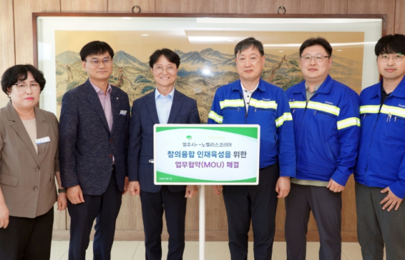 영주시는 지난 16일 노벨리스코리아 영주공장과 함께 지역 청소년의 창의융합 역량 강화를 위한 업무협약(MOU)을 체결했다고 밝혔다.이번 협약은 4차 산업혁명 시대를 대비해 지역 청소년들이 창의적인 문제 해결 능력과 융합적 사고를 갖춘 미래형 인재로 성장할 수 있도록 지원하기 위해 마련됐다. 협약식에는 이재훈 영주시장 권한대행을 비롯한 영주시 관계자와 노벨리스코리아 영주공장 관계자 등이 참석했다.협약의 주요 내용은 △영주로봇챌린지 등 창의융합 프로그램 운영 △청소년 방과후 활동 및 동아리 지원 △세계 수준의 융합 콘텐츠 체험 기회 제공 등이다. 양 기관은 앞으로도 지속적인 협력과 실질적인 교육 지원 활동을 추진해 나갈 계획이다.노벨리스코리아 영주공장은 지난 2019년부터 ‘코리아로봇챔피언십 영주대회’를 꾸준히 후원해왔으며, 현재까지 총 63개 팀 287명의 학생들이 대회에 참가하는 등 지역 청소년들의 창의융합 역량 강화에 기여해왔다. 특히 2024년 대회에서는 대영중학교 학생들이 전체 2위를 차지하며 세계대회 출전권을 획득하는 등 우수한 성과를 거두기도 했다. 참가 학생들은 로봇 코딩 교육과 멘토링 등 맞춤형 프로그램의 지원을 통해 실질적인 역량을 키워가고 있다.이재훈 영주시장 권한대행은 “이번 협약은 단순한 로봇대회 후원을 넘어, 지속가능한 지역 창의융합 인재 양성 생태계 구축이라는 점에서 큰 의미가 있다”며 “앞으로도 지역기업과 협력하여 지역 청소년들에게 다양한 성장 기회를 제공할 수 있도록 노력하겠다”고 밝혔다.한편, 이번 협약은 5년간 유효하며, 영주시와 노벨리스코리아 영주공장은 공동 프로그램 기획과 예산지원 등 실질적인 협업을 통해 교육발전특구 사업과의 유기적 연계도 적극 추진할 방침이다.