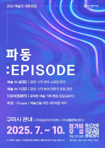 (재)구미문화재단(대표이사 이한석)은 오는 7월부터 10월까지 지역 예술인을 위한 네트워킹 프로그램 `파동 : Episode`를 운영하며, 이에 참여할 전문 예술인을 모집한다. 예술인 네트워킹 `파동 : Episode`는 예술인들이 현실 속 고민과 경험을 나누고, 새로운 협업 기회를 모색하며, 동료 예술인들과 유대감을 형성할 수 있도록 기획된 프로그램이다. 지난해 말에 진행된 ‘예술인(IN) 살롱, 예술인 쉼표’의 성과와 참여자 의견을 바탕으로, 보다 깊이 있는 교류와 실질적인 협력이 가능하도록 사업을 기획했다.`파동 : Episode`는 ▲소모임 토크 `예술 IN 썰(說)` ▲전문가 초청 강연 `예술 IN 지(知)` ▲협업 기회 제공 `다모작(多謨作) : 집단지성` ▲네트워킹 파티 `파장 : Finale` 등 총 4개 프로그램으로 운영된다. `예술 IN 썰(說)`은 장르별 소그룹으로 자유롭게 이야기 나누는 토크 프로그램으로, 동료 예술인 간 깊은 공감과 유대를 형성하는 시간으로 진행된다. `예술 IN 지(知)`는 예술 분야 전문가를 초빙해 예술계의 흐름과 실전 경험을 공유하는 시간으로, 예술 생태계의 흐름과 창작에 필요한 인사이트를 제공한다. `다모작(多謨作) : 집단지성`은 다양한 분야의 예술인이 팀을 이루어 하나의 작품 기획안을 만들어 보는 협업 프로그램으로, 예술인들이 장르 간 융합과 공동 창작의 가능성을 실험해 보는 시간으로 진행된다. 마지막으로 진행되는 `파장 : Finale`는 참여자들의 작품 활동을 전시 형태로 공유하고, 자유로운 소통과 교류가 어우러지는 네트워킹 파티 시간으로 마무리된다. 구미문화재단 이한석 대표이사는 “이번 예술인 네트워킹 `파동 : Episode`는 단순한 인맥 형성이나 일회성 만남이 아닌, 예술인들이 서로의 이야기를 깊이 있게 나누고, 실제 협업으로 이어질 수 있도록 기획된 프로그램으로, 장르를 넘나드는 다양한 예술인의 시선이 모여 지역 예술 생태계에 새로운 파동을 만들어 내길 기대한다”고 밝혔다. 프로그램 참여 신청은 예술 관련 전공 졸업자 또는 예술활동증명을 받은 전문 예술인으로, 지역 예술인과 교류하고자 하는 누구나 가능하다. 프로그램별로 15명에서 50명 내외를 모집하며, 자세한 사항은 구미문화재단 홈페이지에서 확인할 수 있다.