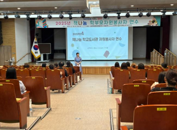 경상북도김천교육지원청은 6월 18일 관내 초, 중, 고등학교 책나눔 학부모자원봉사자 및 학교도서관 자원봉사에 관심있는 학부모 60여명을 대상으로 ‘2025년 책나눔 학부모자원봉사자 연수’를 김천학생문화예술센터에서 개최했다. 책나눔 학부모자원봉사자들은 학교도서관 전담인력 부족 문제를 해소하기 위하여 학생들을 대상으로 도서 대여와 반납, 이용자 등록증 및 대출증 발급, 도서 정리 등을 해오고 있다. 이날 연수는 교사 손신향(김천여자고등학교 사서교사)의 학교도서관 운영에 따른 실무 중심 강의로 시작됐다. 이어서 ‘빨치산의 딸’, ‘아버지의 해방일지’등을 저술한 정지아 작가의 특강이 진행됐다. 정지아 작가는 자신의 삶과 아버지의 이야기를 바탕으로 소설이 어떻게 탄생했는지 진솔하게 풀어내어 참석자들의 공감과 성찰을 이끌어 냈다. 모태화 교육장은 ˝학부모 자원봉사자들의 자발적인 봉사활동으로 학교도서관이 활성화 되고 있다. 오늘 강의가 자원봉사자 여러분의 활동에 자긍심을 더하는 계기가 되기를 바란다.”라고 말했다.