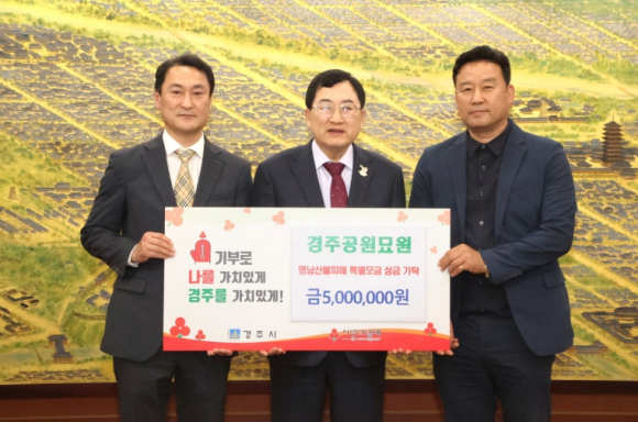 2025년 4월 16일, (재)경주공원묘원은 최근 발생한 영남지역 대형 산불로 큰 피해를 입은 이재민들을 돕기 위해 성금 500만원을 기탁했다.이번 기탁은 산불로 삶의 터전을 잃고 어려움을 겪고 있는 이재민들에게 따뜻한 위로와 실질적인 도움이 되기를 바라는 마음에서 이루어졌다. 기탁된 성금은 피해 복구와 이재민의 생계 지원 등에 사용될 예정이다.(재)경주공원묘원은 1981년 개장 이후 40년 넘게 지역사회와 상생하며 지속적인 사회공헌 활동을 이어온 기업이다. 평소에도 도움이 필요한 이웃을 위해 다양한 지원을 펼쳐왔으며, 지역사회의 일원으로서 책임을 다하는 데 앞장서왔다.배진석 이사장과 임직원 일동은 “경주공원묘원은 지역사회와의 연대감을 무엇보다 중요하게 생각해 왔으며, 이번 영남지역 산불로 인해 큰 피해를 입고 삶의 터전을 잃은 이재민들의 생활이 조금이나마 더 빨리 회복되기를 바라는 마음에서 성금을 전달하게 됐다”며 “앞으로도 지역사회를 위한 따뜻한 나눔을 실천하며, 사회적 책임을 다하는 기업이 되겠다”고 밝혔다.주낙영 경주시장은 “경주시의 대표적인 공원묘원에서 마음을 함께 나눠주시니 더욱 감사하게 생각한다. 보내주신 성금은 영남지역 산불 피해 이재민들에게 잘 전달될 수 있도록 하겠다”고 전했다.
