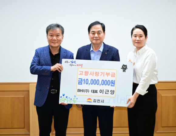 (주)BHI 이근양 대표 등이 20일 김천시에 고향사랑기부금 1,000만 원을 기부했다. ㈜BHI는 주택건설사업을 하는 중견기업으로 율곡동에 주상복합(349세대)아파트를 추진 중에 있으며, 다방면의 사회공헌활동을 통해 지역사회에 선한 영향력을 전파하고 있다. 이근양 대표는 “지역사회와 함께 성장하는 것이 기업의 중요한 책임 중 하나라고 생각한다.”라며 “김천시와의 뜻깊은 인연으로 앞으로도 다양한 활동을 통해 따뜻한 나눔을 꾸준히 이어갈 것”이라고 밝혔다. 배낙호 김천시장은 “지역사회에 따뜻한 관심을 가지고 나눔을 실천해 주신 ㈜BHI 이근양 대표 및 직원 일동에게 감사드린다.”라며, “전달해 주신 따뜻한 관심과 더불어 시에서도 복지와 지역사회 발전에 최선을 다하겠다.”라고 말했다. 고향사랑기부제는 개인이 지자체에 기부함으로써 지역 균형발전을 도모하고, 기부자에게는 세액공제와 함께 지역 특산품 등을 답례품으로 제공하는 제도로 운영되고 있다.