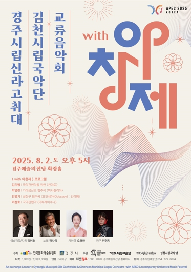 경주시는 오는 8월 2일 오후 5시, 경주예술의전당 화랑홀에서 ‘경주시립신라고취대·김천시립국악단 교류음악회 with 아창제’를 개최한다고 밝혔다.이번 공연은 경주시와 한국문화예술위원회(ARKO)가 공동 주최하며, 2025 APEC 정상회의의 경주 개최를 기념해 기획된 특별 무대다.‘아창제(ARKO한국창작음악제)’는 국악과 양악을 아우르는 창작 관현악 활성화를 위해 추진 중인 한국문화예술위원회의 특성화 브랜드다.이번 교류음악회에서는 그간 선정된 우수 창작 국악 작품 중 수준 높은 곡들만을 선별해 프로그램으로 선보일 예정이다.또한, 이날 공연에는 우리 시대를 대표하는 소리꾼 장사익이 출연해 특별 무대를 꾸미며 감동을 더할 계획이다.경주시립신라고취대는 신라 고대음악의 철저한 고증과 재현을 기반으로 창단된 세계 유일의 문화예술 공연팀으로, 고취 행렬 퍼포먼스부터 현대 창작 음악에 이르기까지 폭넓은 공연 활동을 통해 지역 문화예술 발전과 시민 문화 향유 확대에 기여하고 있다.주낙영 경주시장은 “2025 APEC 정상회의 경주의 주제가 ‘우리가 만들어가는 지속가능한 내일’인 만큼, 이번 공연이 경주의 문화예술 자산이 세계로 뻗어나가는 계기가 되길 바란다”며, “가장 한국적인 도시 경주에서 열리는 뜻깊은 무대인 만큼, 시민들과 문화예술계 관계자 모두에게 깊은 울림을 전할 수 있도록 철저히 준비하겠다”고 밝혔다.공연 티켓은 경주예술의전당 홈페이지 및 티켓링크를 통해 예매할 수 있으며, 전석 5천 원(단체 관람 40% 할인 적용 시 3천 원)이다.자세한 문의는 시립예술단 운영팀으로 하면 된다.