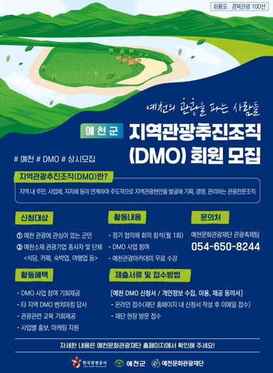 예천문화관광재단은 예천군 관광산업 활성화와 주민 주도의 관광 정책 수립을 위해 ‘지역관광추진조직(DMO) 협의체’ 회원을 오는 6월 23일부터 7월 4일까지 모집한다.DMO(Destination Management Organization)는 지역주민, 관광업계, 지방자치단체 등이 협력해 지속 가능한 지역관광 생태계를 구축하고 관광 활성화를 이끄는 조직이다.올해 예천 DMO 사업은 문화체육관광부와 한국관광공사에서 주관하는 국비 공모사업으로 ▲예천 관광 거버넌스 구축 ▲삼강/회룡포 거점 활성화 사업 ▲예천 스토리푸드 개발 등 3개의 사업으로 구성되어 있으며, 예천만의 고유한 관광자원과 콘텐츠를 활용하여 예천 DMO 회원들의 역량강화 및 관광 활성화를 목표로 하고 있다.사업 참여를 희망하는 개인 및 단체는 예천문화관광재단 홈페이지를 통해 신청할 수 있으며, 참여자에게는 DMO 사업 참여기회 제공 및 홍보 마케팅 지원 등 다양한 혜택이 제공될 예정이다.자세한 사항은 예천문화관광재단 홈페이지 또는 관광축제팀을 통해 확인할 수 있다.김학동 이사장은 “이번 DMO 사업은 예천 군민과 함께 만들어가는 관광 생태계의 첫걸음”이라며, “지역과 상생하는 관광 산업을 통해 지속 가능한 성장을 이끌어가겠다”고 전했다.