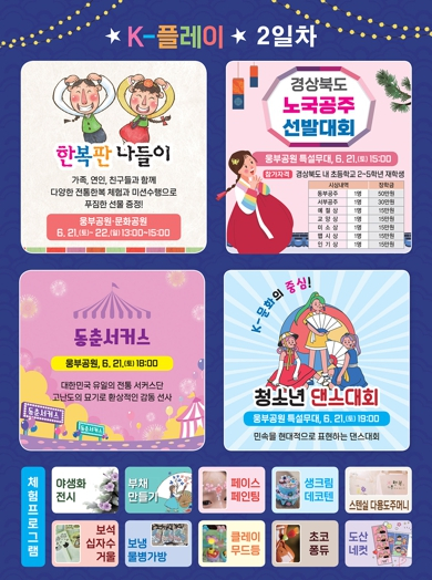 전통과 현대가 어우러지는 문화축제 ‘K-PLAY 안동 페스타’가 6월 20일 성황리에 막을 올린 가운데, 21일 둘째 날에는 ‘한복 입고 놀아보자! K-PLAY 민속대잔치’를 주제로 풍성한 프로그램이 진행된다. 가족, 친구, 연인들이 함께 한복을 입고 다양한 미션을 수행하며 즐길 수 있는 참여형 콘텐츠로 축제의 재미를 더하고, 참여자들에게는 푸짐한 경품도 제공될 예정이다.이날 오후 3시에는 ‘제17회 노국공주 선발대회’가 열린다. 초등학교 2~6학년 학생 34명이 본선에 진출해, 이 가운데 동부공주, 서부공주 등 총 7명의 ‘공주’가 선발된다. 대회와 함께 경상북도 무형문화재인 ‘안동놋다리밟기’ 공연이 함께 펼쳐져 관람객들은 안동 고유의 전통문화를 현장에서 생생하게 체험할 수 있다.오후 6시부터는 축제의 열기를 더하는 공연이 이어진다. 100년 전통을 자랑하는 ‘동춘서커스’는 곡예, 무용, 마술, 음악이 어우러진 현대적인 연출로 새로운 감동을 선사하고, ‘전국 청소년 댄스대회’는 안동 민속 요소를 안무에 반영하는 미션 형식으로 치러져 전통과 창의성이 조화를 이루는 독창적인 무대를 선보인다. 20여 개 팀이 참가해 열정 넘치는 경연을 펼칠 예정이다.지관서가 주차장에서는 오전 11시부터 밤 9시까지 전통의 흥과 정이 살아 숨 쉬는 ‘뒤란주막’이 운영된다. 초가 천막 아래 평상에 앉아 전통 안주와 지역 막걸리를 저렴하게 즐길 수 있고, 지역 어르신들이 ‘안중할멈’으로 분장해 서빙에 나서며 관람객들에게 따뜻한 웃음과 추억을 선사한다. 어린이와 가족 단위 방문객을 위한 시원한 음료도 준비돼 있다.또한 ‘민속놀이터’에서는 제기차기, 딱지치기 등 전통 놀이 체험이 마련되며, 모둠북과 난타 등 버스킹 공연도 함께 펼쳐져 축제장 분위기를 더욱 풍성하게 만든다.안동시 관계자는 “둘째 날에도 모든 세대가 함께 즐길 수 있는 프로그램을 다양하게 준비한 만큼, 많은 시민과 관광객들이 참여해 안동만의 흥과 멋을 체험하고 즐거운 추억을 만들어가시길 바란다”고 전했다.