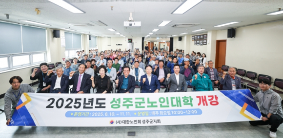 성주군은 지난 6월 10일 대한노인회 성주군지회 강당에서 입학생 70명과 지역 내빈이 참석한 가운데 `2025년도 성주군 노인대학 개강식`을 개최했다.성주군 노인대학은 대한노인회 성주군지회에 위탁하여, 지역 어르신들에게 건전한 취미생활 및 평생교육 기회를 제공하기 위하여 11월 11일까지 주 1회(매주 화요일) 과정으로 노래교실, 치매예방교육, 안전교육, 백세시대 건강노하우 등 다양한 프로그램으로 운영된다.최원조 노인대학장은 “무료해지기 쉬운 노인들의 삶에 건전한 여가 문화와 건강서비스를 통합하여 섭렵할 기회가 되어 감사하며, 한 사람도 빠짐없이 수료를 바란다”라고 전했다.이병환 성주군수는 “배움을 향한 어르신들의 도전과 열정에 깊은 존경의 마음을 전하며, 노인대학을 통해 성취감과 배움의 참 기쁨을 만끽하시길 바라며, 앞으로도 어르신들이 정신적·신체적으로 건강한 노년을 즐길 수 있도록 최선을 다하겠다”고 말했다.