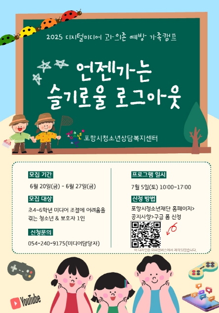 포항시청소년재단 청소년상담복지센터는 오는 7월 5일 디지털 미디어 과의존으로 어려움을 겪는 초등학교 4~6학년 청소년과 학부모를 대상으로 ‘언젠가는 슬기로울 로그아웃 캠프’를 운영한다. 이번 캠프는 ‘디지털 OFF, 감성 ON’을 슬로건으로, 과도한 스마트폰과 디지털 기기 사용에서 벗어나 자연 속에서 가족이 함께 소통하고 정서적 유대를 쌓을 수 있도록 기획됐다. 단순한 통제 중심의 접근을 넘어, 스스로 변화의 필요성을 느끼고 올바른 디지털 사용 습관을 형성할 수 있도록 돕는 것이 핵심 목표다. 주요 프로그램은 ▲숲 체험을 통한 정서 안정 및 자연 교감, ▲가족 요리활동으로 협력과 창의력 향상, ▲부모 대상 디지털 미디어 이해도 향상 교육, ▲레크리에이션을 통한 가족 간 유대감 증진 등으로 다양하게 구성돼 있다. 참가자들은 하루 동안 디지털 기기 없이 오롯이 가족 간 소통과 체험에 집중하며, 일상 속 변화의 실마리를 찾을 수 있는 특별한 기회를 얻게 될 것으로 기대된다. 박시현 포항시청소년상담복지센터장은 “이번 캠프는 디지털 과의존 문제를 단순히 금지하거나 통제하기보다, 가족이 함께 느끼고 자발적으로 변화할 수 있도록 돕는 데 초점을 맞췄다”며, “앞으로도 가정 내 건강한 소통과 성장을 지원하는 참여형 프로그램을 지속 확대해 나가겠다”고 밝혔다. 참가 신청은 포항시청소년재단 홈페이지 또는 구글폼 링크를 통해 가능하며, 무료 진행 및 선착순 마감으로 운영된다. 자세한 문의는 포항시청소년상담복지센터로 하면 된다.