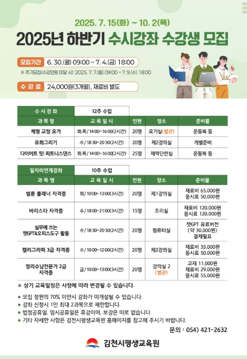 김천시평생교육원은 2025년 하반기 수시강좌 수강생을 오는 6월 30일부터 7월 4일까지 선착순으로 모집한다고 밝혔다. 이번 하반기 수시강좌는 시민들의 다양한 학습 수요를 반영하고, 평생학습 기회 확대와 일자리 연계를 지원하기 위해 마련됐으며, 문화예술 교육과 일자리 연계 과정 등 총 8개 강좌가 운영된다. 강좌는 7월 15일부터 10월 2일까지 김천시평생교육원 각 강의실에서 진행될 예정이며, 김천시에 거주하는 19세 이상 성인이라면 누구나 참여할 수 있다. 수강료는 3개월에 24,000원이며, 재료비와 자격증 응시료는 별도이다. 수강 신청은 김천시평생교육원 홈페이지에서 사전 회원가입 후 가능하다. 하반기 수시강좌에 관한 자세한 사항은 김천시평생교육원 누리집을 참고하거나, 김천시평생교육원으로 문의하면 된다.