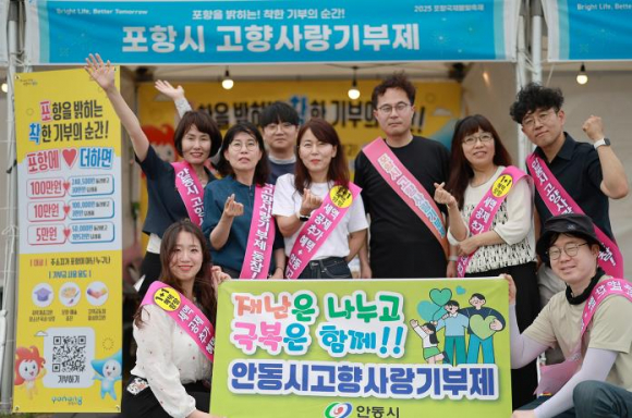 안동시는 6월 20일 포항시 형산강 체육공원에서 열린 ‘2025 포항국제불빛축제’ 현장에서 안동시고향사랑기부제 홍보 캠페인을 펼쳤다.이날 행사는 포항시 고향사랑기부제 홍보부스와 연계해 진행됐으며, 안동시 보육아동가족과장을 포함한 직원 8명이 참석해 축제장을 찾은 포항시민과 관광객에게 고향사랑기부제의 참여 방법과 혜택을 알렸다.현장에서는 리플릿 500부를 배부하고, 어깨띠와 피켓을 활용한 거리 캠페인을 통해 시민의 눈길을 끌었다.특히 산불피해로 인해 특별재난지역으로 지정된 안동시에 10만 원 이상 기부 시, 기존 16.5%에서 33%로 확대된 세액 공제 혜택을 집중 홍보해 큰 관심을 받았다.이번 행사는 포항시와의 협력을 통해 진행된 것으로, 안동시는 앞으로도 다양한 외부 축제와 연계한 고향사랑기부제 참여를 독려하고 기부문화 확산에 힘쓸 계획이다.이은주 보육아동가족과장은 “지역 발전과 이웃을 위한 따뜻한 기부가 보다 많은 시민에게 전달되길 바란다”며 “안동을 응원하는 가장 직접적인 방법인 고향사랑기부제에 많은 관심과 참여를 부탁드린다”고 전했다.