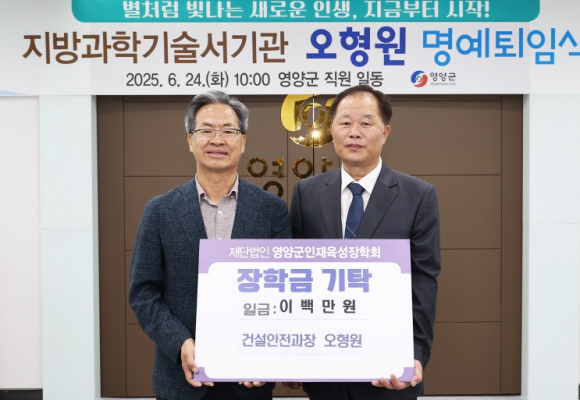영양군은 24일 오형원 건설안전과장이 퇴임을 맞아 (재)영양군인재육성장학금으로 2백만원을 기탁했다고 밝혔다.오형원 건설안전과장은 “30여년의 공직 생활을 잘 마무리할 수 있었던 것은 군민 여러분의 아낌없는 지원과 격려 덕분이라고 생각한다.”며 “그동안 지역 사회에 받은 사랑을 조금이나마 되돌려 드리고 싶었다. 어려운 환경에서도 꿈을 포기하지 않는 지역 학생들에게 작은 보탬이 됐으면 한다.”고 말했다.오형원 건설안전과장은 1994년 입암면에서 첫 공직 생활을 시작으로, 2021년 시설사무관으로 승진 후 지역개발과장, 영양읍장, 건설안전과장으로 역임하면서 탁월한 업무능력을 발휘하여 지역 발전을 위해 많은 기여를 해왔다. 오도창 영양군수는 “공직자로서의 마지막까지 지역 사회를 생각해 주신 오형원 과장님의 따뜻한 마음에 깊이 감사드린다.”며 “오늘 기탁해 주신 소중한 장학금은 영양군 학생들이 훌륭한 인재로 나아가는 밑거름으로 사용하겠다.”고 전했다.(재)영양군인재육성장학회는 각계각층에서 기부한 기탁금과 장학기금을 활용하여 지역 내 우수 학생에 대한 장학사업과 교육환경개선사업 등을 추진하면서 지역 학생들의 교육 기회 확대와 인재 육성에 힘쓰고 있다.
