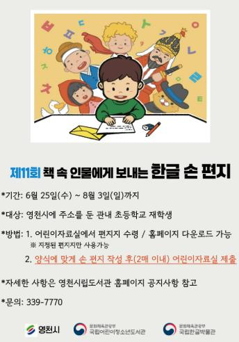 영천시립도서관은 관내 초등학생들의 독서 활성화를 위해 ‘제11회 책 속 인물에게 보내는 한글 손편지’ 공모전을 25일부터 8월 3일까지 개최한다고 밝혔다.영천시에 주소를 둔 초등학교 재학생이면 누구나 참여할 수 있으며, 독서 후 지정된 편지지에 1~2매 분량의 손편지를 작성해 어린이자료실에 제출하면 된다. 편지지는 어린이자료실에서 수령하거나 도서관 홈페이지에서 다운받을 수 있다.이번 공모에 접수된 손편지들은 9월 독서의 달 행사 기간에 도서관에 전시될 예정이며, 이 중 우수작으로 선정된 3편에는 인증서가 수여되고, 국립어린이청소년도서관에 영천시 대표 추천작으로 출품될 예정이다.국립어린이청소년도서관은 참여 도서관에서 추천받은 손편지 중 27편을 선정해 작성 학생에게 문화체육관광부장관상 등을 수여할 예정이며, 수상작은 국립한글박물관과 국립어린이청소년도서관을 비롯해 전시를 희망하는 전국 도서관에 순회 전시될 계획이다.시립도서관 관계자는 “이번 공모전을 통해 관내 초등학생들이 책 읽는 즐거움을 느끼고, 책 속 인물들과의 소통을 통해 책의 의미를 더욱 깊이 이해하는 계기가 되기를 바란다”며, “앞으로도 다양한 독서 프로그램을 운영해 아이들이 풍요로운 마음과 깊이 있는 성장을 이룰 수 있도록 적극 지원하겠다”고 밝혔다.이번 행사와 관련해 자세한 내용은 영천시립도서관으로 전화 문의하거나, 시립도서관 홈페이지를 통해 확인할 수 있다.