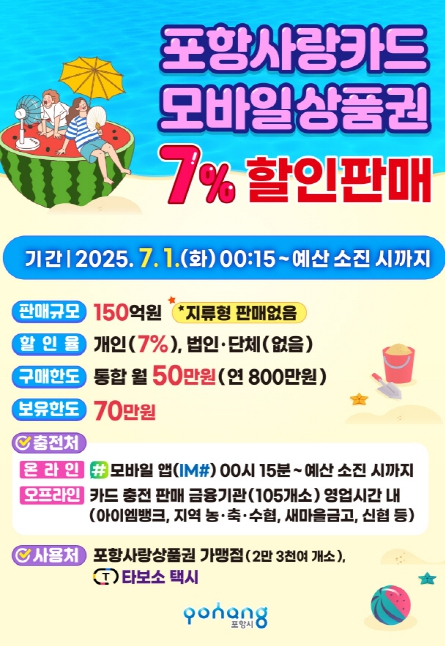 포항시는 지역 소비 활성화를 위해 내달 1일부터 카드형·모바일 포항사랑상품권(이하 포항사랑카드)을 150억 원 규모로 7% 할인 판매를 시작한다. 시는 골목상권 회복과 시민 생활 안정을 위해 전월보다 50억 원 증액된 규모로 상품권을 발행한다. 시는 소상공인 지원과 민생경제 회복을 위해 포항사랑상품권을 연초부터 매월 발행해 올해 발행 규모는 1,300억 원에 이르며, 지난 6월 발행한 100억 원 규모의 포항사랑카드는 6일 만에 완판되는 등 시민들에게 큰 호응을 얻고 있다. 이번 할인판매는 모바일 앱 ‘iM샵’에서 1일 00시 15분부터, 지역 내 105개 판매대행점에서는 영업시간 내에 충전이 가능하다. 개인 월 구매 한도는 50만 원, 연간 한도는 800만 원이며, 보유 한도는 70만 원이다. 단, 지류형 상품권은 판매하지 않는다. 판매 대행 금융기관은 iM뱅크를 비롯해 지역 농협, 수협, 새마을금고, 신협, 산림조합 등이며, 포항시청 홈페이지와 모바일 앱 ‘iM샵’에서 확인할 수 있다. 포항사랑카드는 실물 카드 외에도 ▲삼성페이 ▲네이버페이 QR결제 ▲모바일 앱 QR결제 등 다양한 결제 수단을 지원하며, 지역 내 2만 3천여 개 가맹점에서 사용이 가능하다. 시는 포항사랑카드 이용 활성화를 위해 다양한 혜택도 제공한다. ‘타보소택시’ 자동결제 이용 시 최대 20% 적립 혜택이 예산 소진 시까지 주어지며, 청소년층을 대상으로 한 환급 이벤트도 7월 31일까지 운영한다. 이번 이벤트는 만 14세~19세 청소년이 포항사랑카드로 5만 원 이상 결제하면 5천 원, 10만 원 이상 결제 시 1만 원을 추첨을 통해 총 200명에게 환급하는 방식으로 진행된다. 지급은 8월 중 포항사랑카드로 이뤄질 예정이다. 이강덕 포항시장은 “포항사랑상품권 할인판매로 침체된 지역경제가 활력을 되찾길 바란다”며, “앞으로도 지역경제 활성화를 위한 다양한 시책을 지속적으로 추진하겠다”고 말했다.