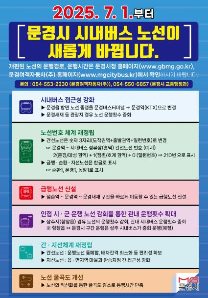 문경시는 노선의 장거리화 및 공차 운행거리 증가로 인한 효율성 저하 등의 문제 해결과 이용 시민들의 편의 증진을 위해 오는 7월 1일부터 시내버스 운행 이후 최초로 시내버스 노선체계 전면 개편을 시행한다고 밝혔다.이번 시내버스 노선체계 개편의 주요 내용은 간선⋅지선 노선의 역할을 명확히 하기 위해 장대노선을 읍⋅면소재지를 중심으로 간선과 지선으로 분리하여 간선노선은 중복노선을 통폐합하여 기존 50개에서 40개로 축소했고, 지선노선은 읍⋅면 내부지역과 간선노선과의 연계성을 높이기 위해 기존 18개에서 20개로 늘렸으며, 순환노선도 중⋅고등학생들의 이용편의를 위해 기존 1개에서 3개로 노선을 확대하는 등 지역 간 접근성 향상을 위해 서비스를 강화했다.이 외에도 중부내륙철도(KTX)라는 새로운 교통수단과 문경역세권 도시개발사업 등으로 인한 도시 공간구조 변화 등에 선제적으로 대응하기 위해 문경읍의 환승거점을 기존 문경버스터미널에서 문경역으로 변경했으며, 시내 중심과 문경역, 관광지와의 연계성 강화를 위해 급행노선(점촌 ~ 점촌역 ~ 모전오거리 ~ 문경시청 ~ 마성(마성파출소) ~ 문경역 ~ 문경새재)을 신설했다.시내버스 노선번호 체계는 기존 2자리에서 간선노선은 첫 자리는 도착권역을 두 번째 자리는 출발권역 의미하는 3자리 숫자로 변경했고, 급행⋅지선⋅순환노선은 급행1, 문경1, 순환1 등 한글로 표현하여 쉽게 인식할 수 있도록 했다.시는 시내버스 노선체계 개편 후에도 지속적으로 모니터링을 실시하여 시민들의 시내버스 이용 불편을 빠르게 개선해 나갈 계획이다.신현국 문경시장은 “이번 시내버스 노선 개편은 올 해 시행한 시내버스 무료화와 더불어 대중교통 혁신을 위해 필요한 부분으로 시민들 뿐만 아니라 관광객들도 편리하게 이용할 수 있도록 교통여건을 지속적으로 개선하기 위해 최선을 다하겠다”고 말했다.