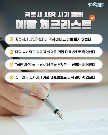 포항시는 최근 전국적으로 발생하고 있는 공무원 사칭 계약 사기와 관련해 지역 내 유사 피해를 예방하기 위해 시민과 지역 업체를 대상으로 각별한 주의와 경계를 당부했다. 공무원 사칭 사기는 주로 시청이나 공공기관의 직원인 척하며 가짜 명함과 위조된 공문을 활용해 물품 납품 계약 체결을 시도하거나 선입금을 요구하는 방식으로 이뤄진다. 최근 포항시 내 공구상사에서도 시청 소속 공무원을 사칭한 사람이 허위 공문을 제시하고 물품 납품을 요구했지만 이를 의심한 상인이 시청에 직접 확인하면서 사기 시도가 무산된 사례가 있었다. 포항시는 이러한 피해를 막기 위해 계약 요청이나 구매 제안을 받은 경우 ‘소속 부서명’과 ‘담당자 실명’을 반드시 확인하고, 포항시 대표전화 등을 통해 진위를 확인해야 한다고 강조했다. 또한 ‘급한 일정’이나 ‘긴급 납품’을 이유로 거래를 서두르거나, 문서 없이 전화로만 거래를 진행하려는 경우, 공문 등을 들고 직접 방문해 거래를 유도하는 경우에도 반드시 의심하고 확인 절차를 거칠 것을 당부했다. 포항시 관계자는 “정식 공무원은 개인 휴대폰으로 거래를 요구하지 않으며, 개인 계좌로 돈을 입금하라고 하는 경우는 절대 없다”며 “위조된 명함, 공문, 계약서 등 수상한 문서를 수령하거나 사기 행위가 의심될 경우, 즉시 포항시 또는 가까운 경찰서로 신고해달라”고 덧붙였다. 한편 포항시는 유사 피해를 사전에 차단하기 위해 SNS 등을 활용해 시민들에게 주의를 당부하는 등 다각적인 홍보 활동을 펼치고 있다.