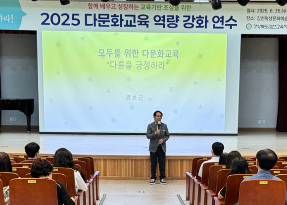 경상북도김천교육지원청은 6월 25일 관내 유ㆍ초ㆍ중등 교원을 대상으로 ‘함께 배우고 성장하는 교육기반 조성을 위한 2025 다문화교육 역량 강화 연수’를 마련했다. 본 연수는 이주배경학생의 증가에 따른 사회통합과 성숙한 다문화 사회를 대비하기 위한 다문화이해교육이 강조되고 있으며 국내출생, 중도입국, 외국인가정 학생 등 다양한 이주배경을 지닌 학생들의 맞춤형 교육지원 방안을 모색할 필요에 따라 마련됐다. 연수를 통해 변화하는 다문화사회에 대한 이해를 높임과 더불어 이주배경학생들이 마주하게 되는 환경적인 부분을 이해하고 극복해 나가는데 학교와 사회가 함께 할 수 있는 도움에 대한 안내가 이루어졌다. 또한, 모든 학생을 위한 다문화교육의 방향과 사례에 대한 안내를 받으면서 다름을 긍정하는 학교 문화로의 전환에 대해 생각해 보는 시간이 됐다. 모태화 교육장은 ˝이주배경학생들에 대한 이해와 공감을 바탕으로 모든 학생들을 위한 세계시민교육으로의 다문화교육이 운영될 수 있도록 지속적인 관심으로 지원해 나가겠다.˝고 전했다.