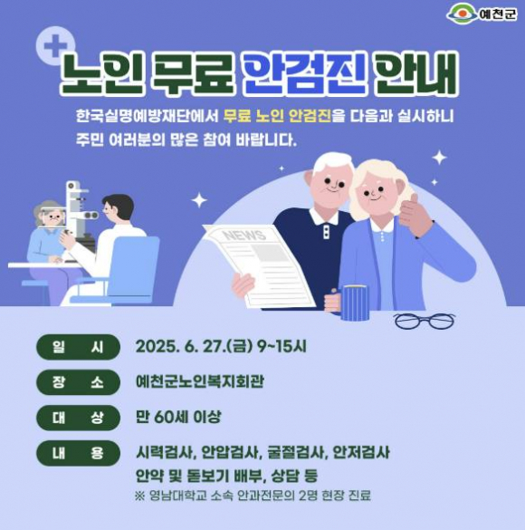 예천군은 27일 오전 9시부터 예천군노인복지관에서 노인 실명예방사업의 일환으로 ‘노인 무료 안(眼)검진’을 실시했다.한국실명예방재단과 함께 실시한 이날 검진은 만 60세 이상 노인들을 대상으로 안 검진을 통한 안질환을 조기에 발견하고 치료하기 위해 마련됐으며, 이를 통한 노인들의 안질환에 대한 사전예방 및 인식개선과 시각장애로 인한 사회적 비용부담 경감에 목적을 두었다.이번 검진은 상담, 시력검사, 안압 검사, 굴절검사, 세극등현미경검사로 진행되며 검사 결과 백내장, 녹내장, 망막질환 등이 발견되어 수술을 요하는 만 60세 이상 기초생활수급자 및 저소득 주민에게는 개안 수술비도 지원된다. 수술비 지원을 받기 위해서는 수술 전 안과 진료 소견서와 구비서류를 지참하여 보건소를 방문, 개안수술 신청서를 제출하면 된다.안남기 보건소장은 “안과 질환은 조기 검진이 무엇보다 중요하다”며, “어르신들께서 실명으로 이어질 수 있는 안질환을 예방할 수 있도록 정기적인 검진과 적절한 치료를 받으시길 바란다”고 전했다.