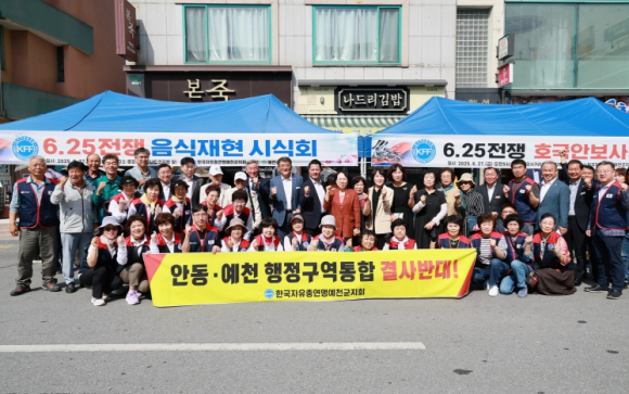 한국자유총연맹 예천군지회(회장 김경섭)는 27일, 호국보훈의 달과 6·25전쟁 75주년을 맞아 호국 선열의 숭고한 희생정신을 기리고 당시 상황을 재현하기 위해 예천읍 중앙사거리에서 ‘6·25전쟁 음식 재현시식회’ 및 ‘호국안보 사진전시회’를 개최했다. 이날 행사를 위해 예천군 여성회원과 청년회원 30여 명이 정성스럽게 음식을 준비했으며, 6·25전쟁 당시 먹었던 보리개떡, 쑥개떡 등 500명분을 직접 만들어 예천군민들에게 시식 기회를 제공해 빈곤했던 그 시절을 간접적으로 경험해 보며 자유의 소중함과 안보의식을 되새기는 시간이 됐다. 김경섭 지회장은 “이번 행사를 통해 6·25전쟁의 아픔과 희생을 잊지않고, 지금 우리가 누리는 자유와 평화에 대한 고마움을 생각해보는 뜻깊은 시간이 됐길 바란다”며 당부의 말을 전했다. 김학동 군수는 “6월 호국 보훈의 달을 맞아 조국을 위해 희생하신 분들의 숭고한 정신을 잊지 말고, 안보의 중요성을 다시 한번 생각하는 시간이 되기를 바란다”며, “예천군은 앞으로도 호국보훈 정신을 계승하고 나라 사랑 실천문화 확산에 함께하겠다”고 말했다.