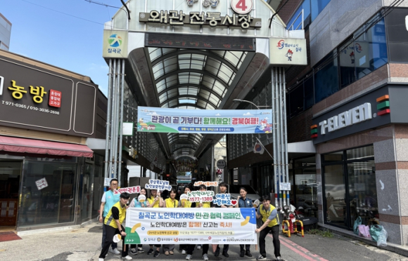 칠곡군은 26일 오후 경상북도남부노인보호전문기관, 칠곡경찰서 여성청소년과, 칠곡군치매안심센터, 국민건강보험공단 칠곡성주지사 칠곡운영센터와 함께 `노인학대예방 민‧관협력 캠페인`을 실시했다.6월 노인학대 집중신고 기간을 맞이해 진행된 이번 캠페인은 왜관읍 장날을 맞아 많은 시민들이 모인 왜관시장과 어르신의전당을 직접 찾아 진행됐으며, 어르신들과 지역 주민들을 대상으로 노인학대 신고 전화번호가 부착된 홍보물품 배포하고, 2025년 노인학대 예방 슬로건인 “노인학대 예방은 함께! 신고는 즉시!”를 적극 홍보했다. 특히, 경상북도남부노인보호전문기관 대학생 홍보단‘시럽(Senior Love) 서포터즈’도 함께 참여해 시민과의 적극적인 소통을 통해 노인 인권 보호의 중요성을 알리고 캠페인에 활력을 더했다.칠곡군은 지역사회와의 지속적인 협력을 통해 노인학대에 대한 경각심을 높이고, 어르신들이 안전하고 존엄한 삶을 누릴 수 있는 사회적 분위기를 조성해 나갈 예정이다.