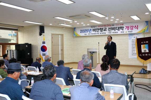 의성군은 지난 6월 24일, 의성군립도서관 1층 회의실에서 ‘2025년 비안향교 선비대학 개강식’을 개최했다.이날 개강식에는 향교 관계자와 수강생 100여 명이 참석했으며, 김주수 의성군수의 특강과 함께 성균관대학교 박평선철학박사의 인문학 강의가 진행돼 참가자들의 큰 호응을 얻었다.비안향교 선비대학은 오는 9월 16일까지 매주 화요일 오후 1시 30분부터 5시까지 총 13주 동안 운영되며, 철학, 예절, 풍수, 건강, 법률, 인공지능(AI) 등 다양한 분야의 전문가가 참여해 폭 넒은 인문교육을 제공한다.특히, 올해는 ‘AI 시대와 선비정신’, ‘전통의례의 이해’, ‘웃음으로 소통하자’ 등 현대적 요소를 접목한 강의가 마련돼, 세대와 분야를 아우르는 의미 있는 소통의 장이 될 것으로 기대를 모은다.김주수 의성군수는 ‘활기찬 의성군정과 향교의 역할’을 주제로 한 특강에서 “전통과 현대, 세대 간의 조화를 이루어지는 오늘의 의성에서 선비정신을 군정에 반영해 따뜻하고 품격 있는 지역사회를 만들어가겠다”며, “비안향교 선비대학이 군민과 함께 성장하는 인문교육 장으로 자리매김할 수 있도록 적극 지원하겠다”고 말했다.