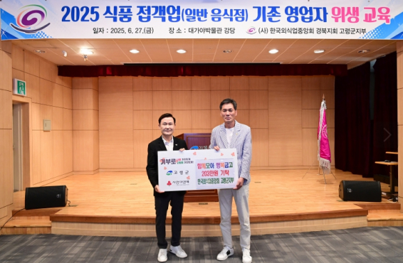 한국외식업중앙회 고령군지부에서는 6월 27일 대가야박물관 강당에서 개최된`한국외식업중앙회 고령군지부 2025년 위생교육`행사에서 ‘함께모아 행복금고’ 성금 203만원을 기탁했다. 한국외식업중앙회 고령군지부(지부장 시진권)에서는“생계에 어려움을 겪고 있는 저소득계층에게 조금이나마 보탬이 되기를 바라며 앞으로도 나눔을 통해 이웃사랑을 실천하겠다”고 말했다. 고령군은“경기가 어려운 와중에도 성금 기탁을 통해 나눔 실천을 해주셔서 감사의 뜻을 전하며 앞으로도 주위의 어려운 이웃들에게 많은 관심과 응원을 부탁드린다”고 말했다.