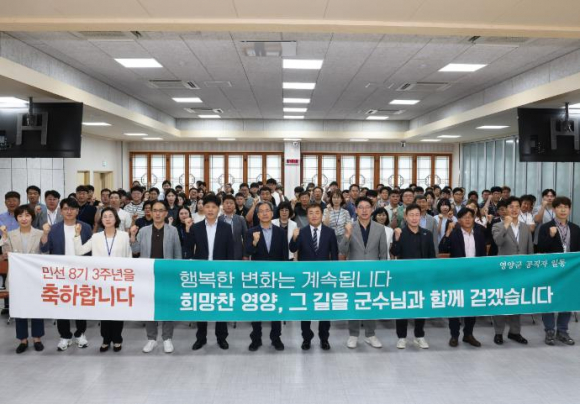 영양군은 민선 8기 출범 3주년을 맞아, 7월 1일 군청 대회의실에서 “직원 만남의 날”을 개최하고, 지난 3년간 군정 성과를 되돌아보며 새로운 도약을 다짐하는 뜻깊은 자리를 가졌다.이번 행사는 민선 8기의 3년을 함께 걸어온 직원들의 노고를 격려하고, 남은 1년의 비전을 공유하며 더욱 단단한 조직문화를 만들기 위해 마련했다.특히, “함께 한 3년, 더 나아갈 1년! 더 큰 희망으로 보답하겠습니다.”라는 슬로건 아래, 군민을 위한 행정과 지속 가능한 지역발전이라는 공동의 목표를 되새기는 시간이 됐다.오도창 영양군수는 “지난 3년간, 길게는 지난 7년간 어려운 여건 속에서도 군민을 위한 정책 실현에 헌신해 준 모든 직원 여러분들께 감사 드린다.”며, “남은 1년, 우리 모두가 한마음으로 더 큰 희망을 만들어 가는 영양군의 미래를 함께 열어나가자.”고 당부했다.영양군은 앞으로도 군민 중심의 책임행정을 강화하고, 직원 간 소통과 협력을 통해 공직사회의 활력을 높여 나갈 계획이다.한편 영양군 공무원노동조합은 민선 8기 3주년을 축하하고, 직원들의 그간의 노고를 격려하는 커피차(영양 벅스)를 제공해 직원들에게 응원과 감사의 마음을 전했다.